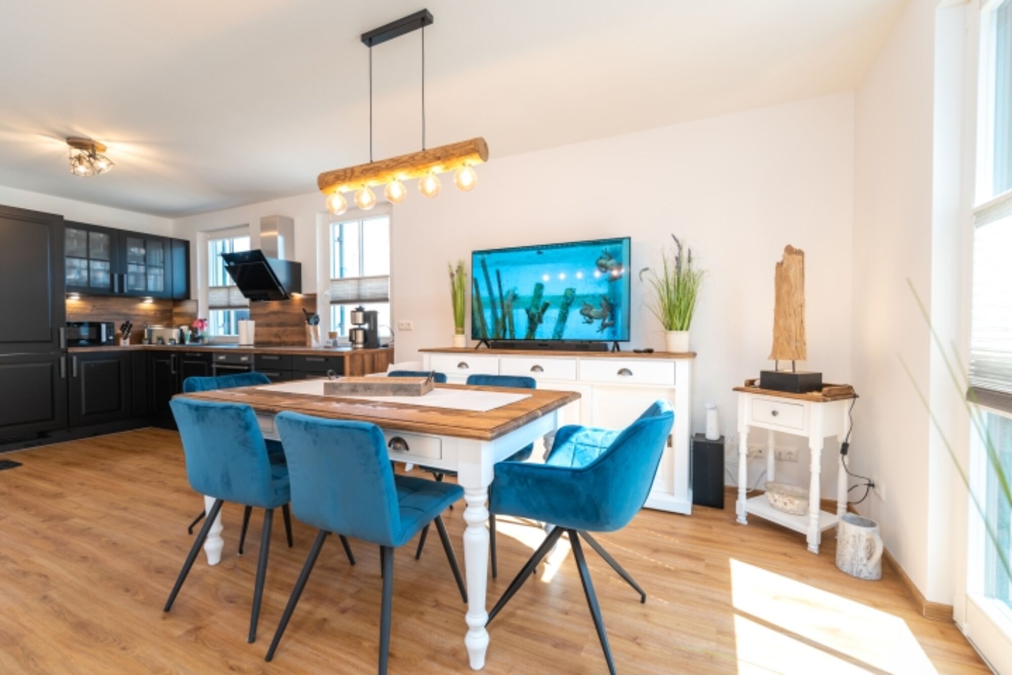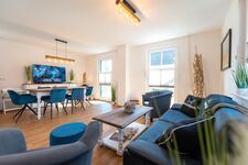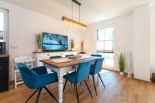 Der offene, helle Wohnbereich lässt entspannte Urlaubstimmung aufkommen. Eine gemütliche Schlafcouch (Aufbettung möglich) mit großem Flatscreen-TV, ein Esstisch für bis zu 6 Personen und eine modern ausgestattete Küchenzeile mit Geschirrspüler, Kaffeemaschine, Toaster, Mikrowelle und Wasserkocher bilden einen gelungenen Wohnbereich für die ganze Familie.