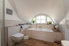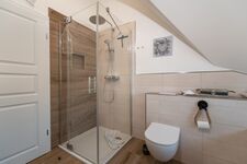 In der ersten Etage befindet sich außerdem ein modernes Badezimmer mit geräumiger Walk-In-Dusche und einer Badewanne.