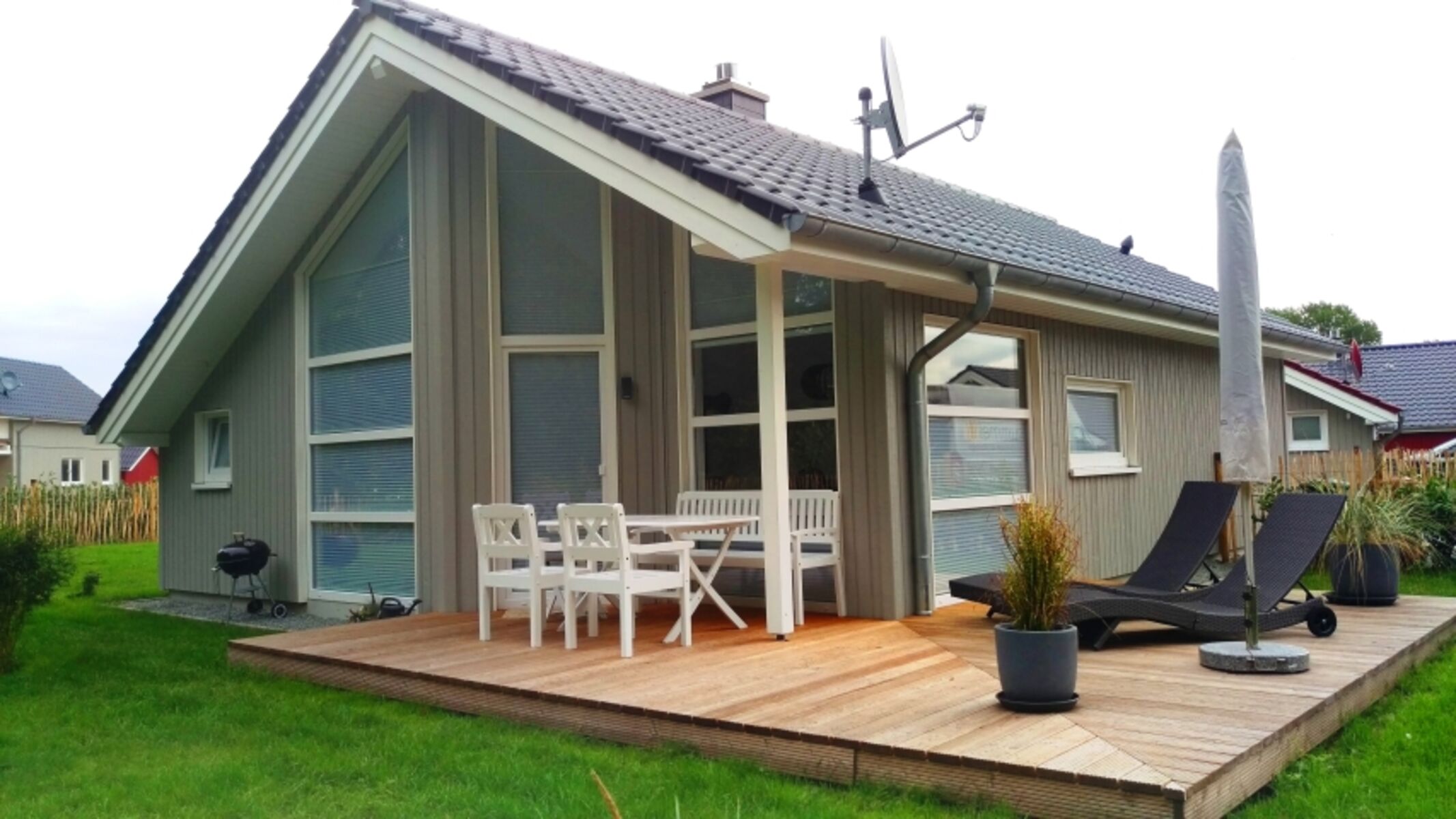 Außenausstattung: Terrasse, PKW-Stellplatz, Gartenmöbel, Liegen, Sonnenschirm, Grill, Sandkiste, eingezäunter Garten, Bollerwagen