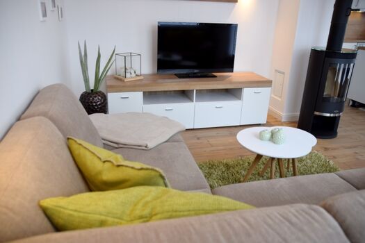 Sky, TV-Flachbildschirm, CD-Player, Bücher, Kaminofen, Eckcouch