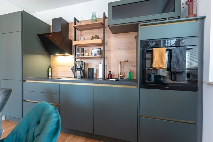 Die Ferienwohnung befindet sich im 1. Obergeschoss und verfügt über einen großzügigen offenen Wohnbereich mit einem komfortablen Schlafsofa, auf dem zusätzliche Gäste Platz finden können. Die vollausgestattete Küchenzeile ermöglicht es Ihnen, Ihre eigenen Mahlzeiten zuzubereiten und in gemütlicher Atmosphäre zu genießen.
