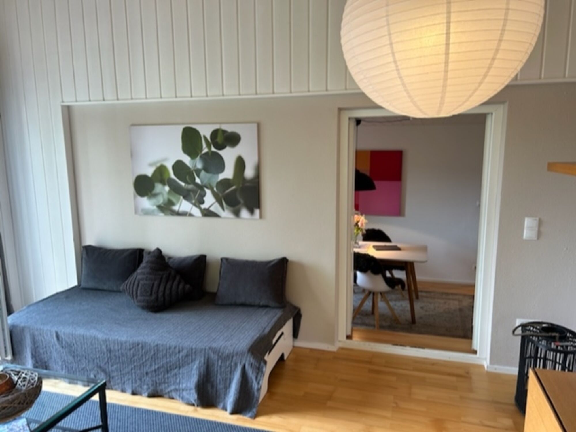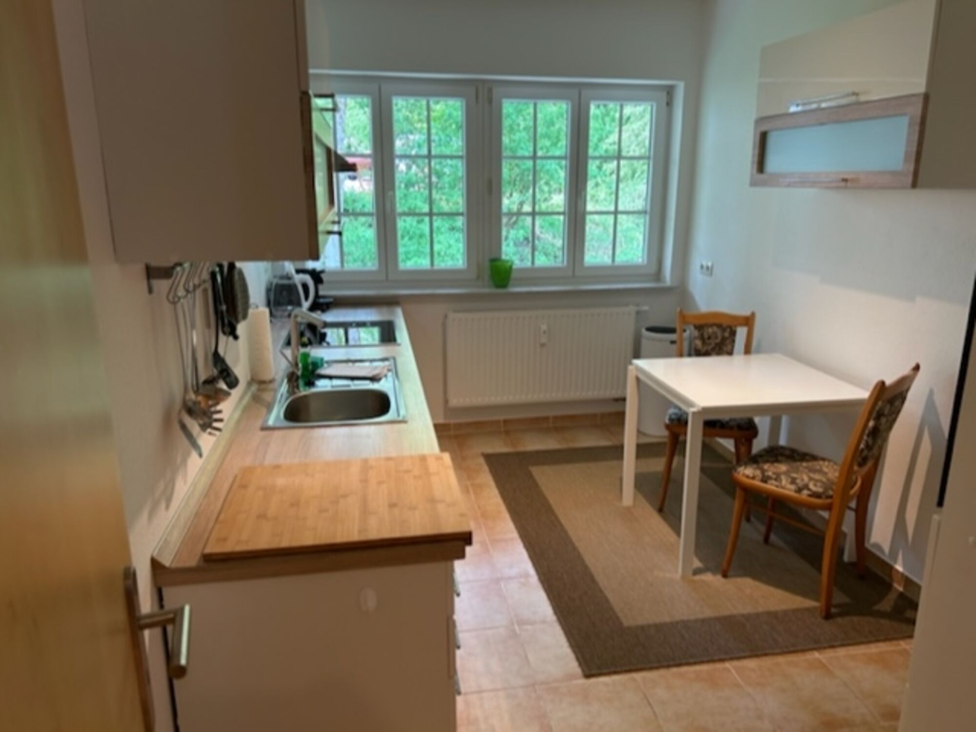 Die Wohnung ist aufgeteilt in ein Wohnzimmer mit TV mit Internetschluß und Zugang zur großen Terrasse. Über 3 Stufen gelangt man ins Esszimmer, Küche, Flur, Schlafzimmer und Badezimmer. Alle Räume sind hell und lichtdurchflutet. Die 3. und 4. Person übernachtet im Wohnzimmer auf den Schlafcouchen.