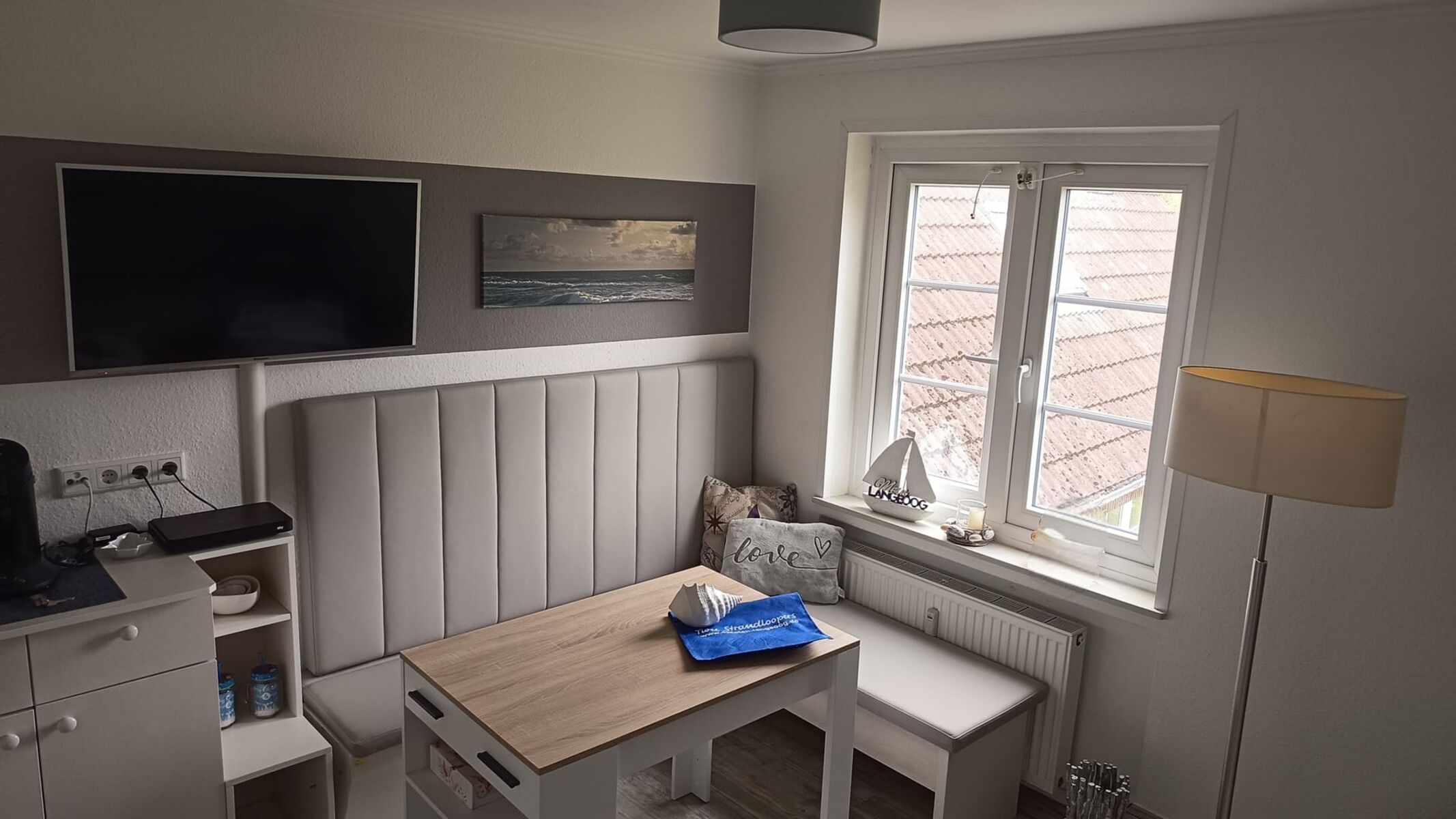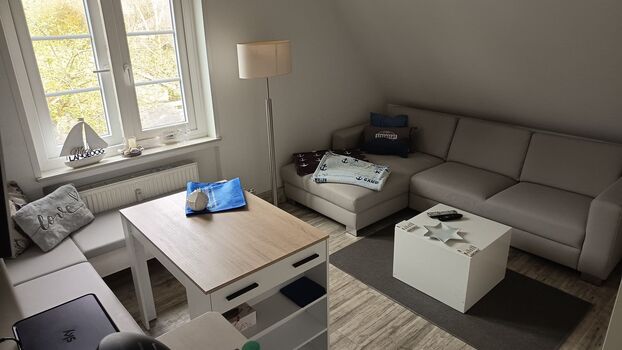 Maritime kleine Ferienwohnung mit kleinem Balkon 1OG 40 qm 2 SZ Wohnküche TV im Schlaf und Wohnbereich Pantryk0che