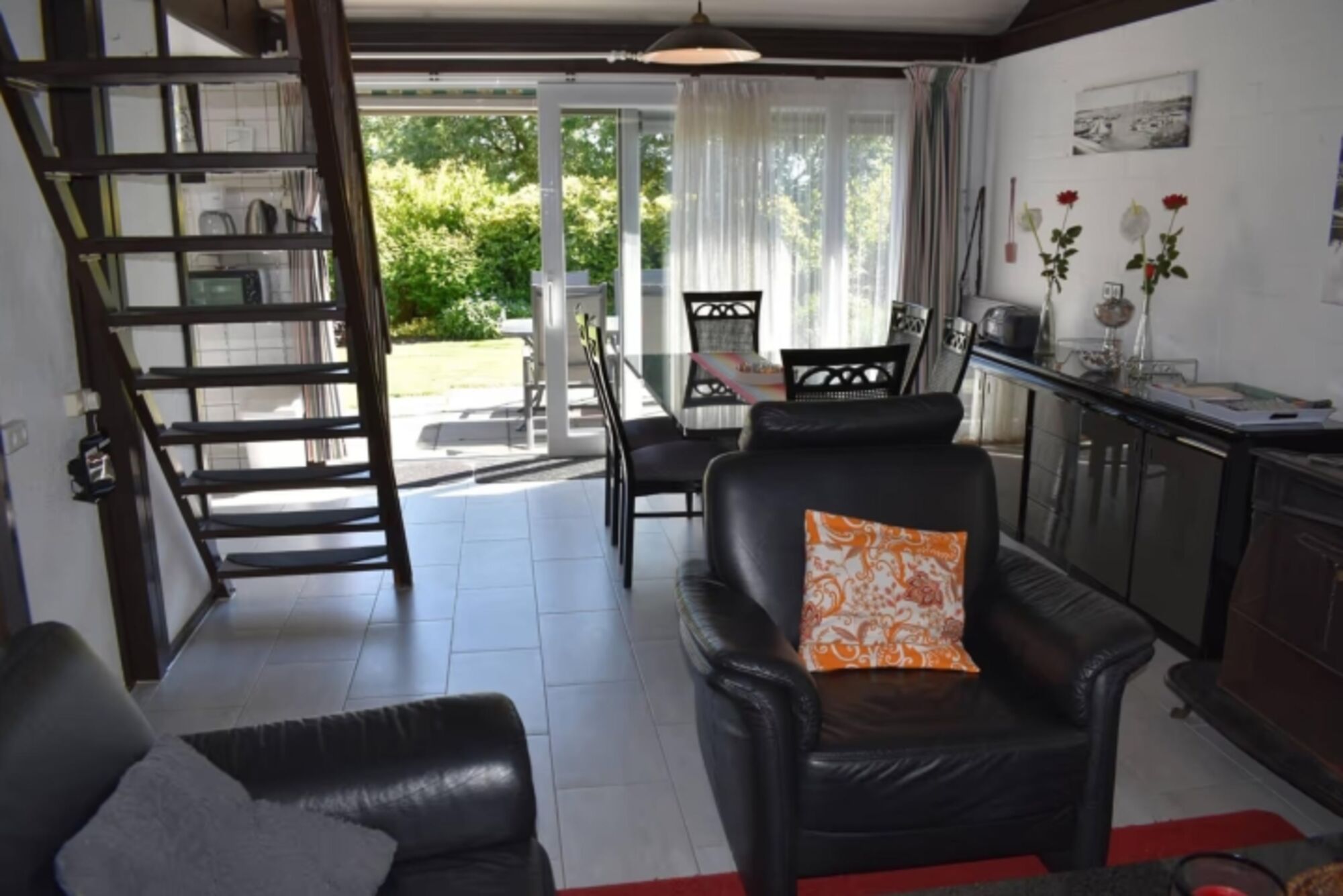 Wohn-/Esszimmer mit Blick in den uneinsehbaren Garten (grosse Schiebetür). Im Garten sind 2 Liegestühle und ein Grill.