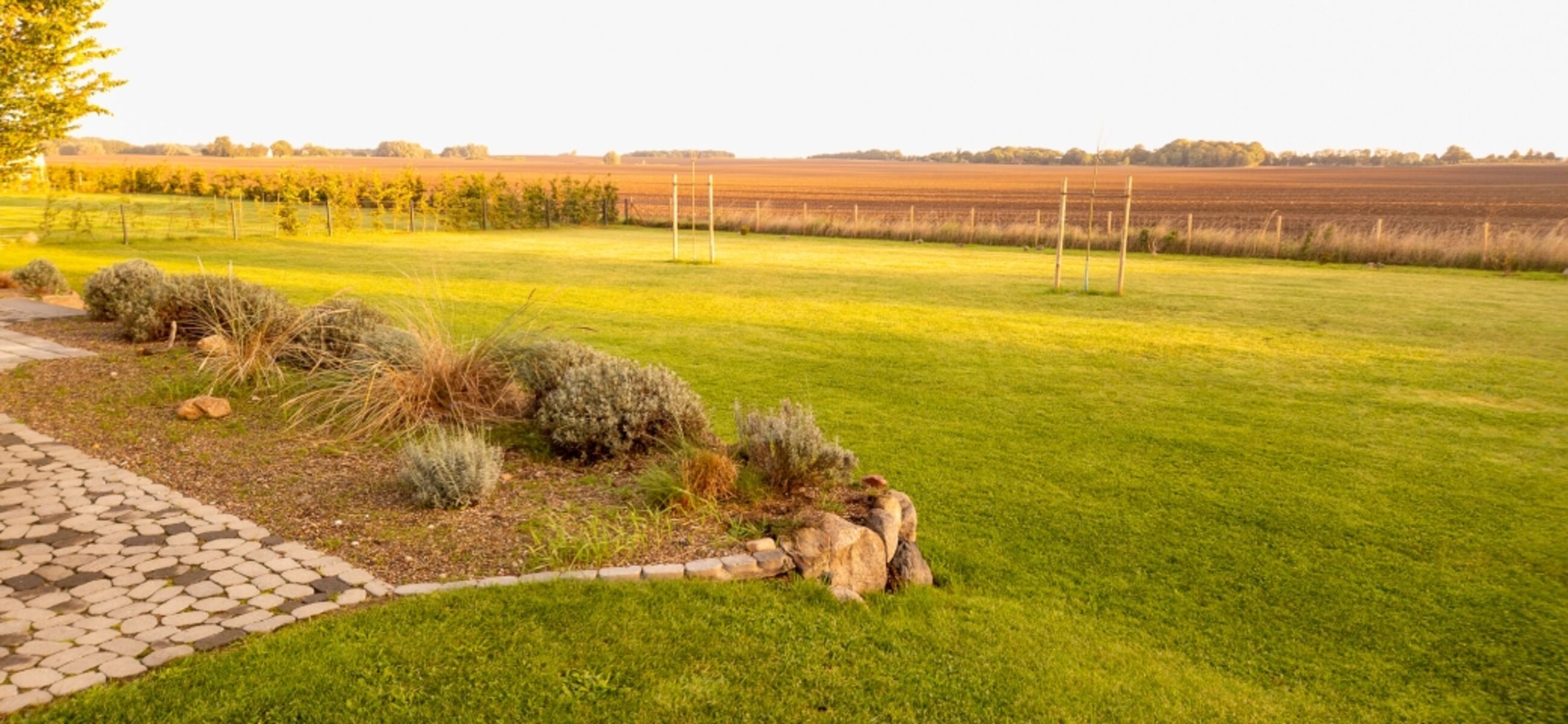 Das großzügige, vollständig eingezäunte Grundstück bietet viel Raum für Kinder und Hunde zum Spielen und Toben. Auf der „Morgenterrasse“ genießen Sie den ersten Kaffee mit Blick über die Landschaft, auf der „Abendterrasse“ lassen Sie den Tag bei warmem Licht und gutem Essen ausklingen.
