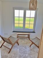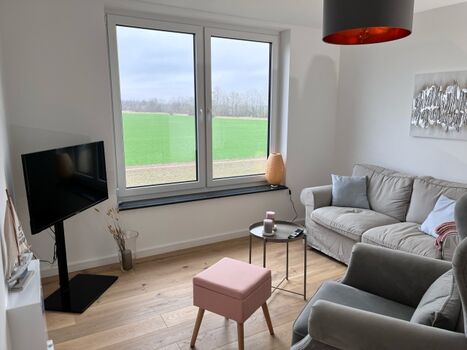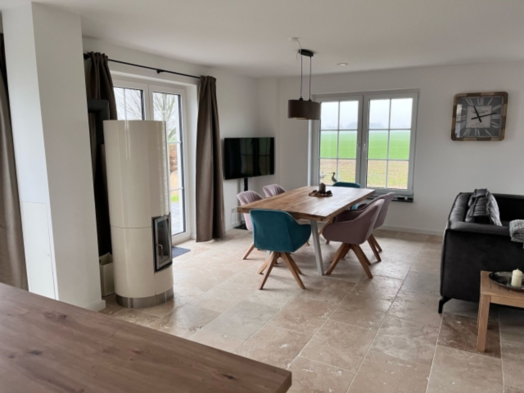 Im Erdgeschoss öffnet sich der große, lichtdurchflutete Wohnbereich mit offener Küche – das Herz des Hauses. Machen Sie es sich auf den bequemen Sofas gemütlich, genießen Sie den weiten Blick über die Felder und lassen Sie sich vom Kaminofen wohlig wärmen.
