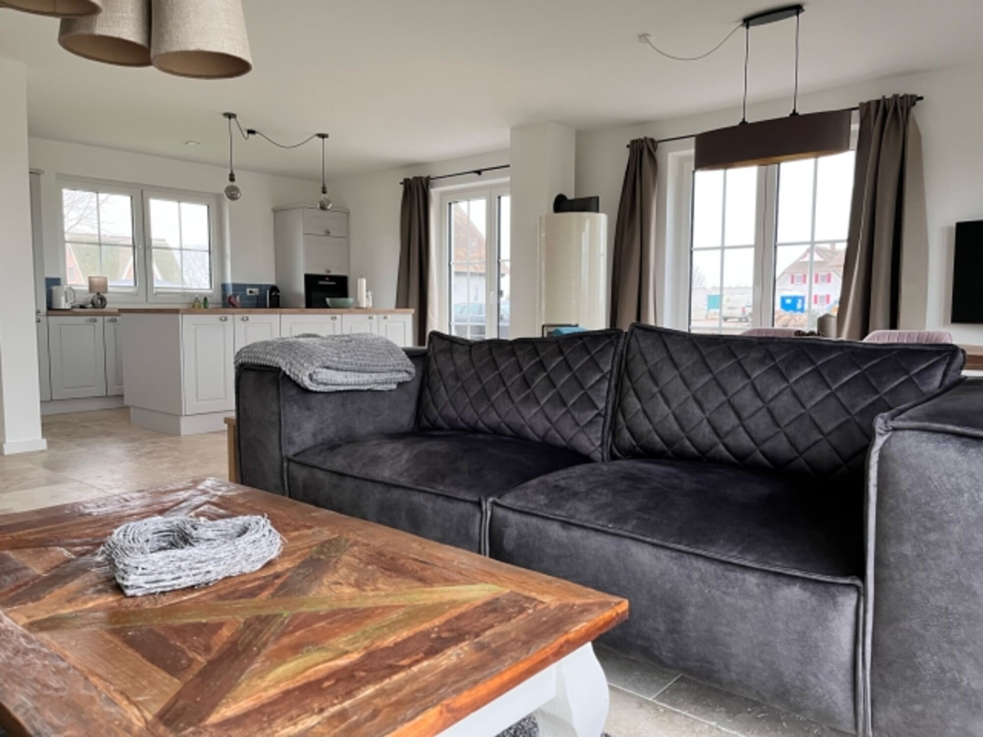 Die hochwertige Küche mit großer Kochinsel lädt zu geselligem Kochvergnügen ein. Am Esstisch finden bis zu sechs Personen bequem Platz – perfekt für lange Familienabende.