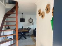 Im Erdgeschoss befindet sich das offene Wohnzimmer mit der integrierten Hochglanzküche, ein Schlafzimmer mit einem Doppelbett, einem Gästezimmer mit zwei getrennten Betten. Im Dachgeschoss befindet sich ebenfalls ein Doppelbett.
