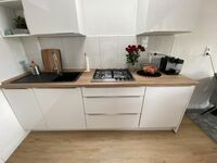 Küche : Die Küche ist gut ausgestattet mit einer Spülmaschine, Gas-Kochfeld, Backofen, Mikrowelle und einen Kühlgefrierschrank. Eine Waschmaschine und ein Wäscheständer, Bügelbrett, Bügeleisen sind im Abstellraum vorhanden