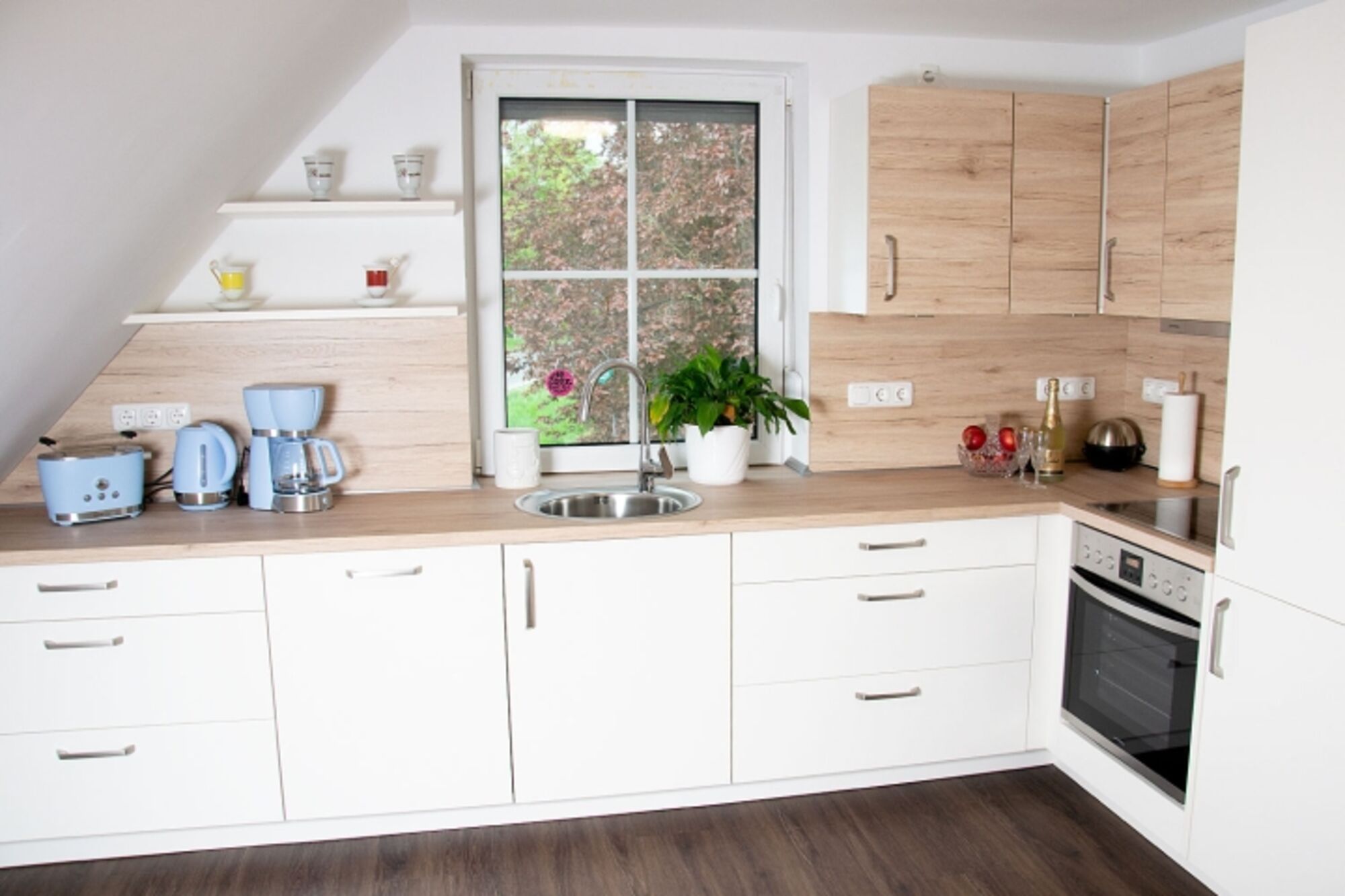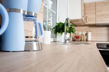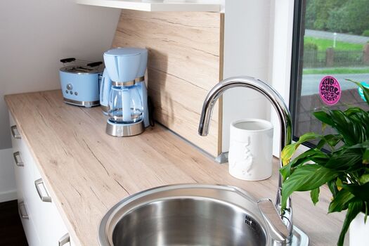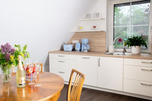 Cerankochfeld, Dunstabzugshaube, Kühlschrank mit Gefrierfach, Eierkocher, Mixer, Korkenzieher / Flaschenöffner, Gewürze (Salz, Pfeffer, Zucker), Öl / Essig, Mülltüten, Essplatz in der Küche