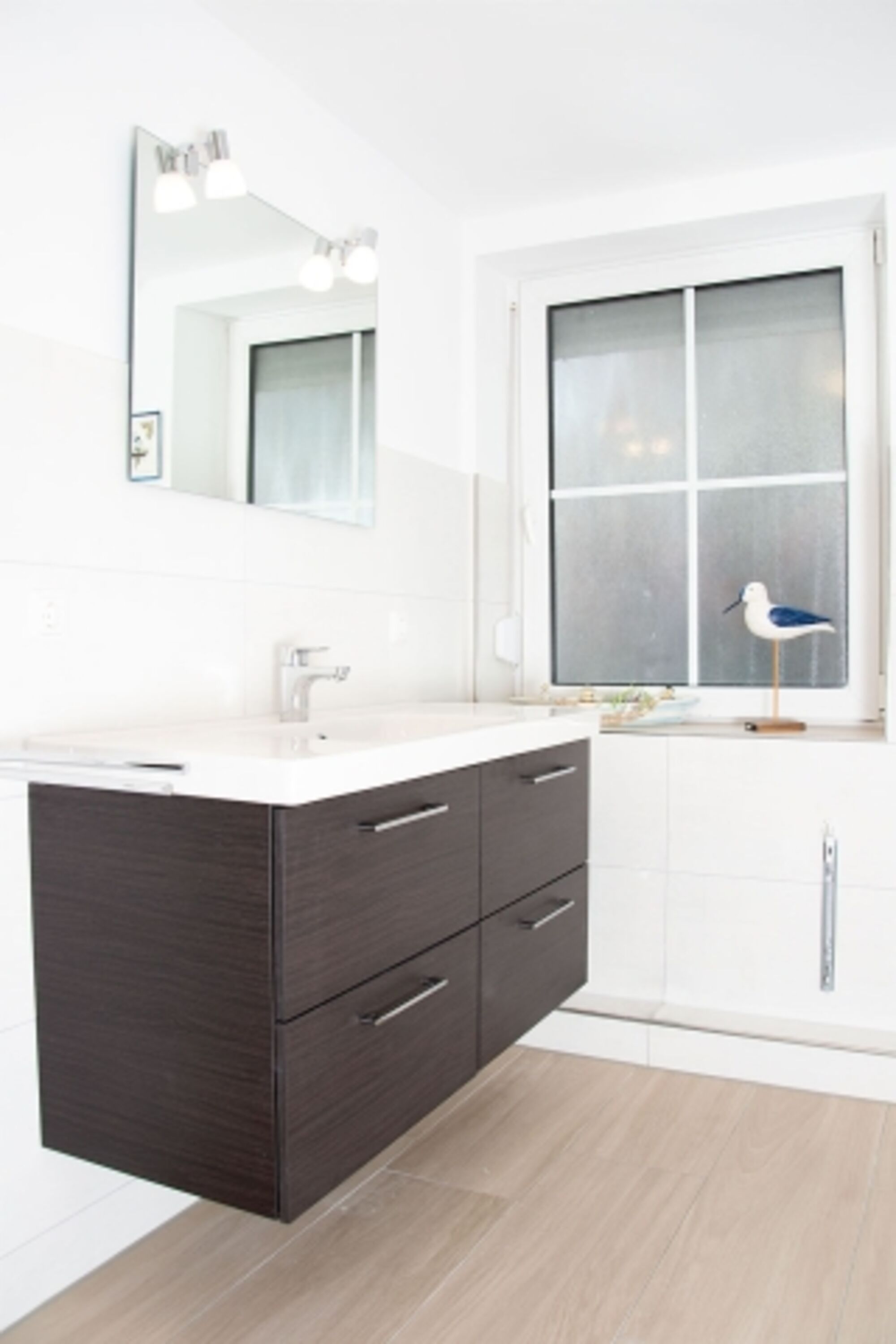Waschbecken, Spiegel, Fenster im Bad
