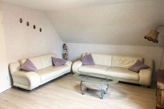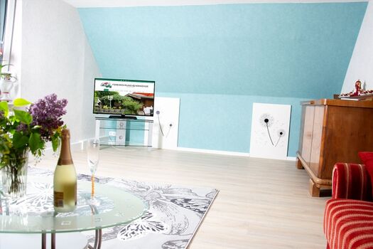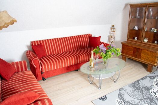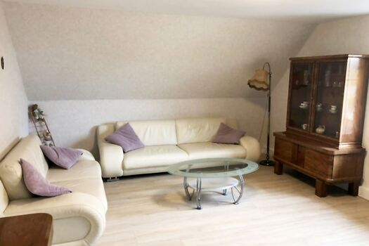 Wir begrüßen sie ganz herzlich in unserer Ferienwohnung. Diese Wohnung liegt im 1 Stock des Hauses. Die Küche wurde komplett saniert,Fußboden, eine nuee Einbauküche mit allen notwendigen Geräten wie Kühlschrank, Geschirrspüler und Herd mit Backofen steht Ihnen zur Verfügung. Das Bad wurde aufwendig saniert. Neue Fliesen, ein neuer moderner Waschplatz, neues wandhängendes WC und eine neue Badewanne, auch zum Duschen geeignet, macht das Bad zu Wohlfühloase. Im Wohnzimmer stehen Ihnen zwei große Ledersofas mit Couchtisch zur Verfügung. Ein Flach-TV ist vorhanden. Das abgeschlossene Schlafzimmer ist mit einem neuen Doppelbett und Schrank ausgestattet. Auf der offenen Schlafempore befinden sich zwi Einzelbetten. Ihnen steht eine große überdachte Terrasse mit Grill und Feuerstelle zur Verfügung.