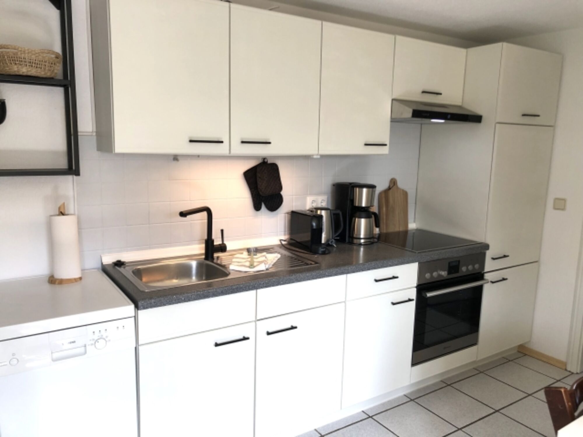 4-Platten Herd, Cerankochfeld, Dunstabzugshaube, Kühlschrank mit Gefrierfach, Nespresso-Automat, Korkenzieher / Flaschenöffner, Gewürze (Salz, Pfeffer, Zucker), Geschirrhandtücher, Mülltüten, Essplatz in der Küche