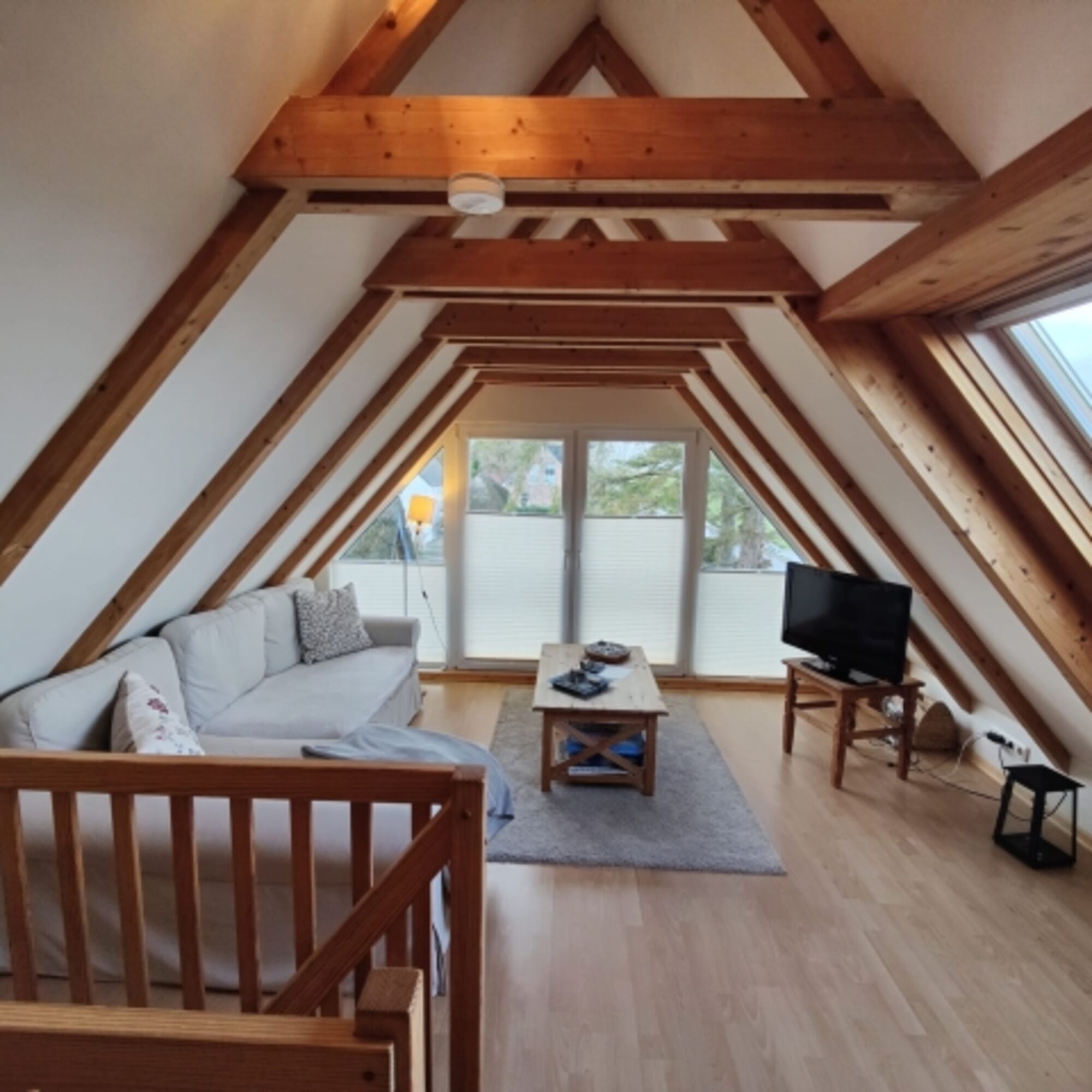 Wohnzimmer: Couch, große Fensterfronten, viel Licht, Flachbildschirm-Fernseher