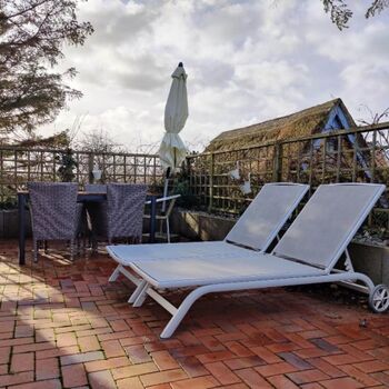 Außenausstattung: Terrasse, Gartenmöbel, Liegen, Sonnenschirm, Grill, eingezäuntes Grundstück