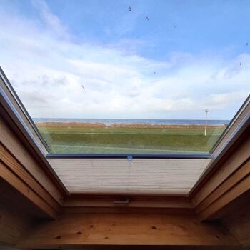 Das Ferienhaus kann mit max. 4 Personen belegt werden und ist ideal für einen erholsamen Familienurlaub. Im Erdgeschoss befindet sich die offene Küche mit dem Essbereich, Duschbad sowie Etagenbett-Schlafzimmer. Über die Treppe gelangen Sie in den offenen Wohn-Schlafraum mit einem Doppelbett sowie einer Couch vor der gr0ßen Fensterfront mit dem Meerblick.
