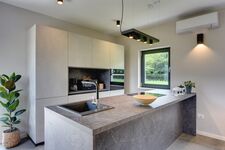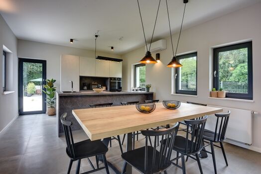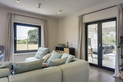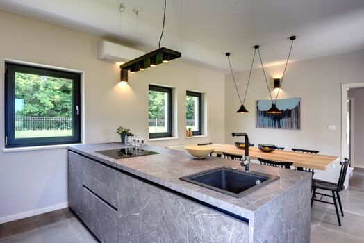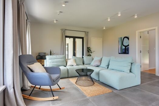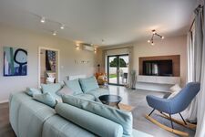 Beim Betreten der Villa werden Sie von der modernen Atmosphäre begeistert sein, die jeden Raum durchdringt. Der Wohnbereich verbindet nahtlos ein stilvolles Wohnzimmer, einen eleganten Essbereich und eine voll ausgestattete Küche. Das viele natürliche Licht, das durch die großen Fenster fällt, schafft eine luftige und angenehme Atmosphäre, die zum Entspannen einlädt.