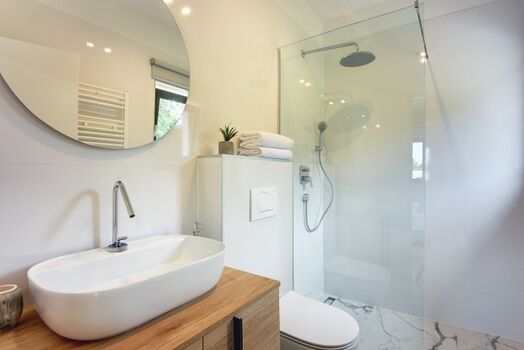 Waschbecken, Spiegel, Fenster im Bad, Bidet