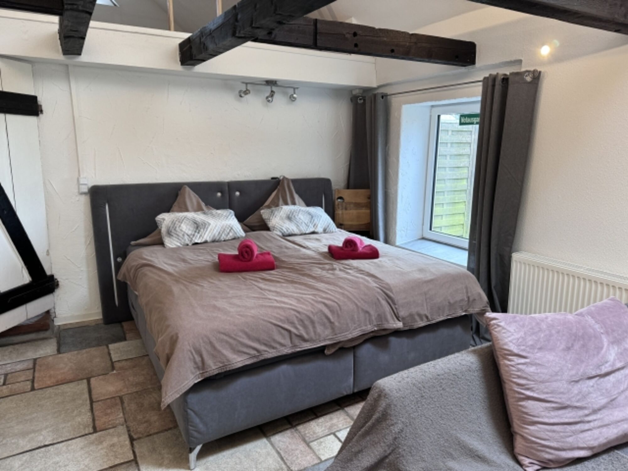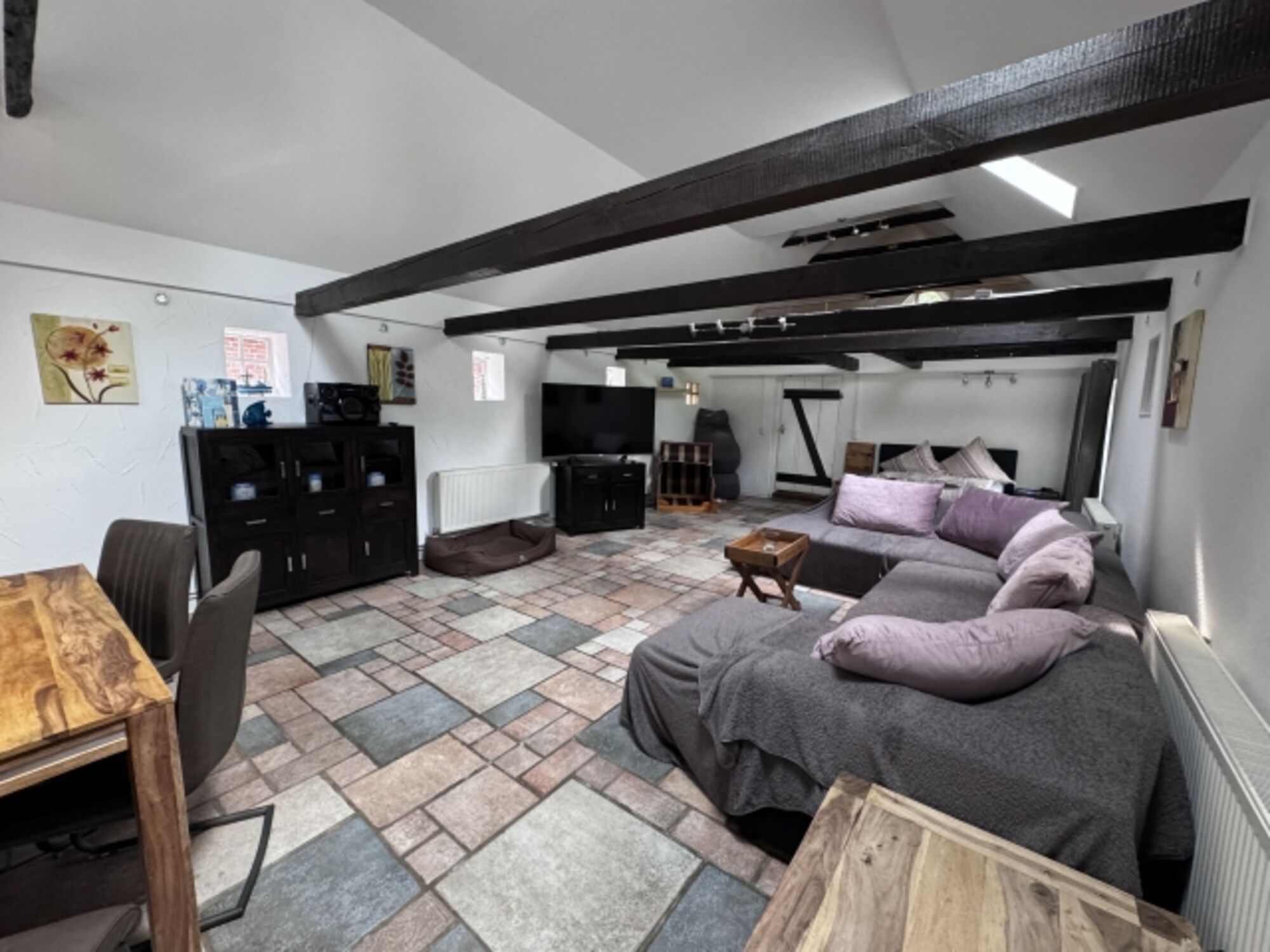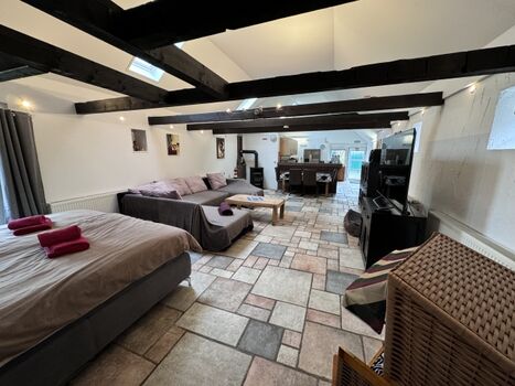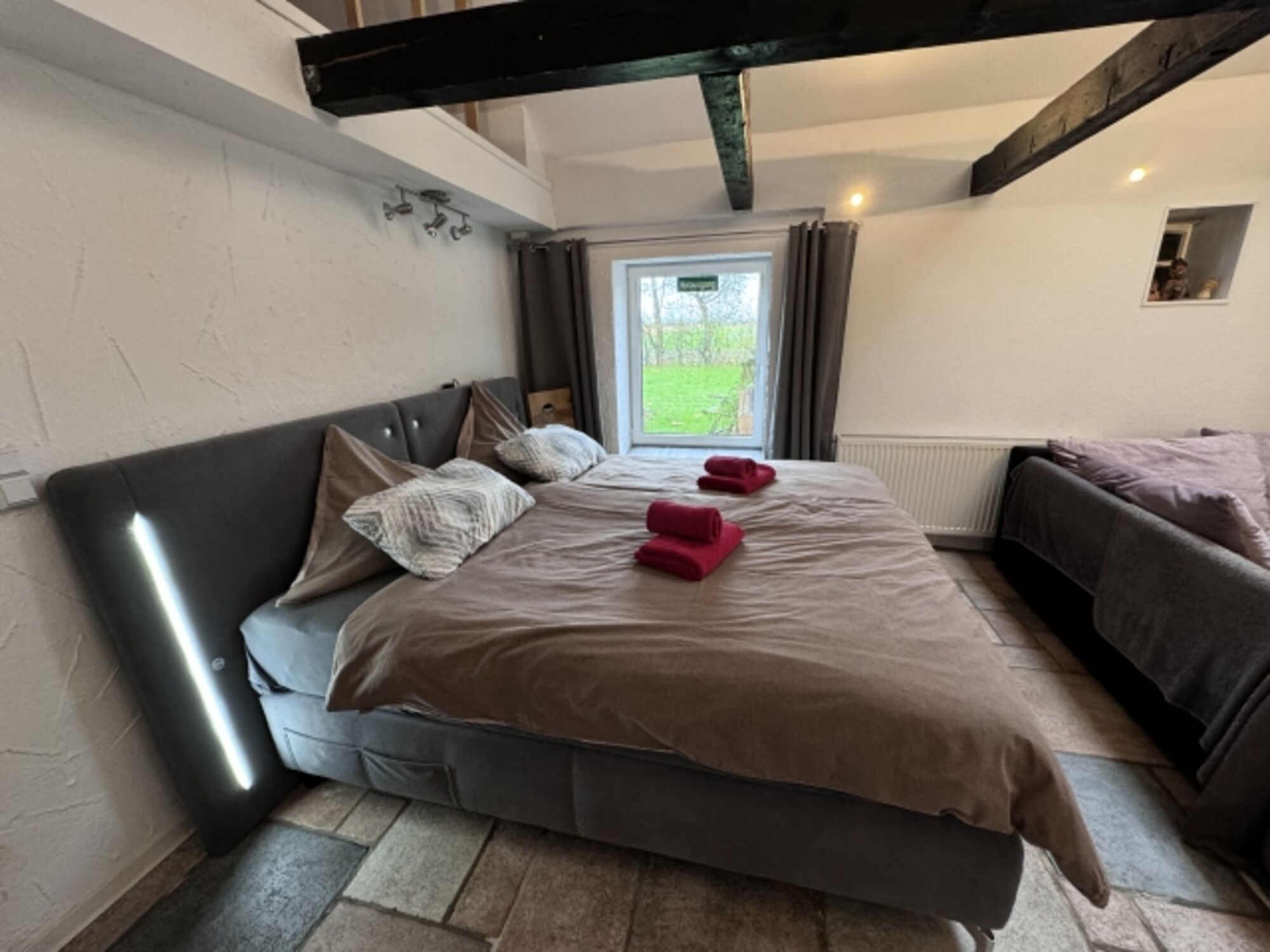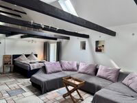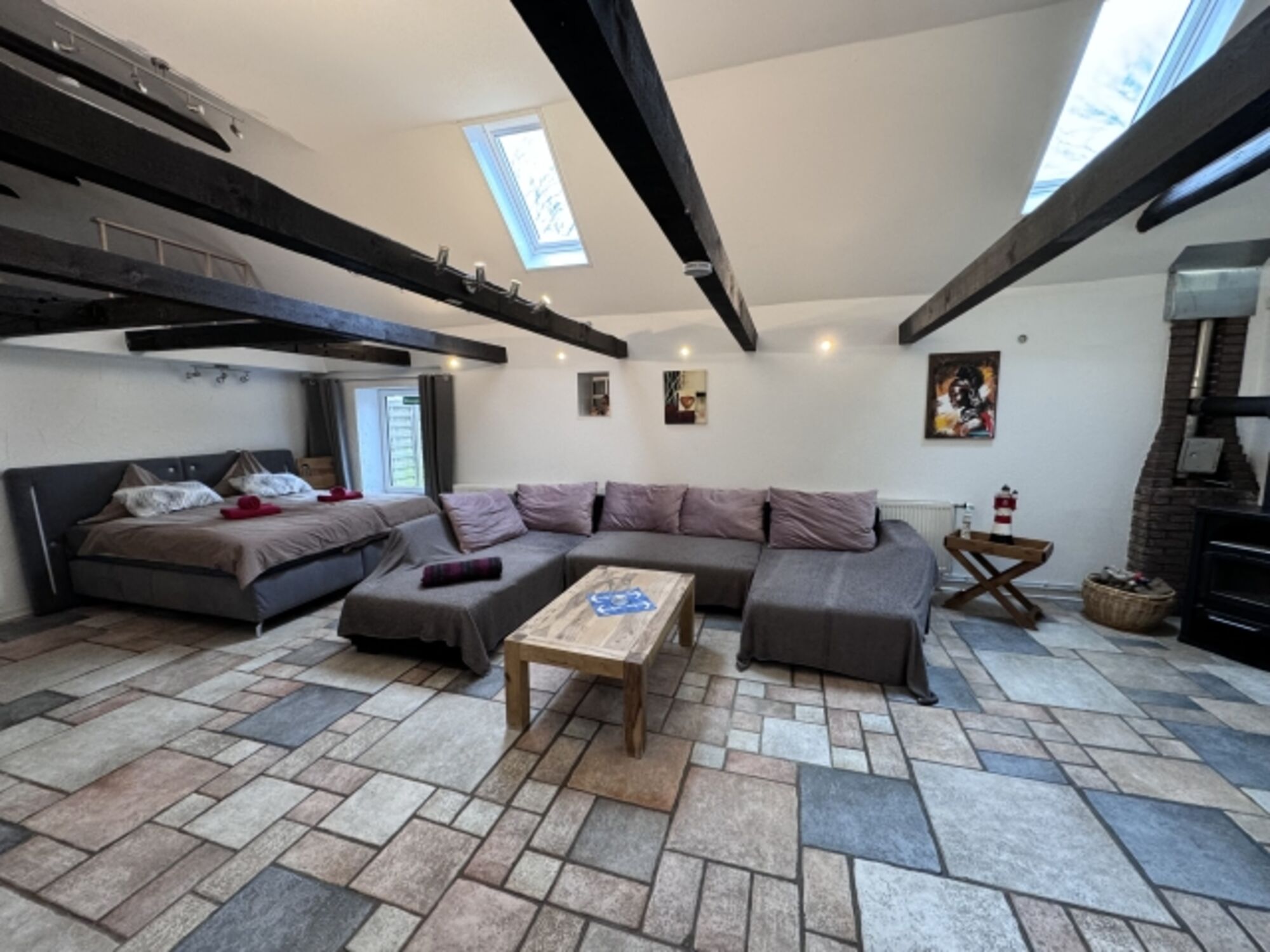Es gibt großes Boxspring-Bett für 2 Personen . Weitere Personen oder Kinder könnten auf der großen Wohnlandschaft übernachten.