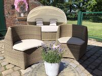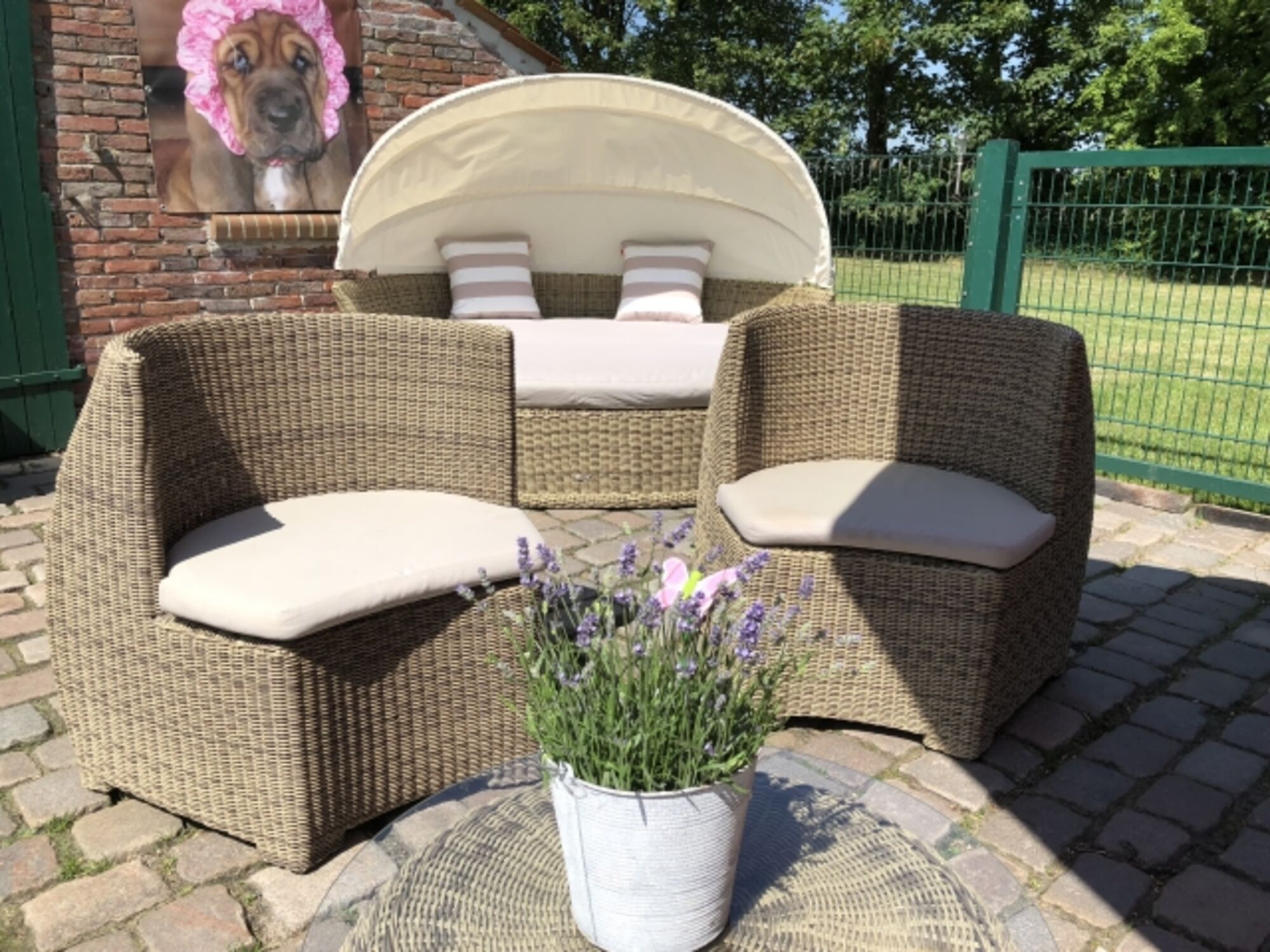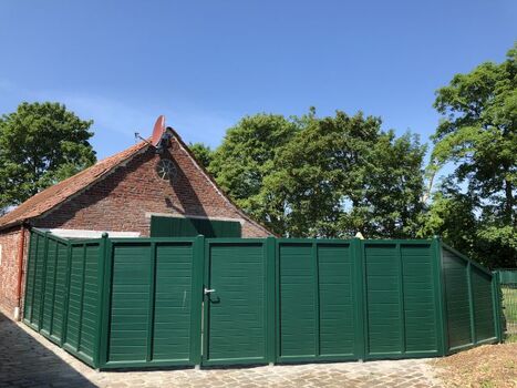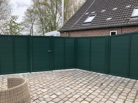 Der Eingangsbereich ist mit einem blickdichten Zaun umschlossen, so daß Sie Ihren eigenen Außenbereich mit Sitzgelegenheit, Liege, Sonnenschirm und großer amerikanischer Grill- Lok haben .