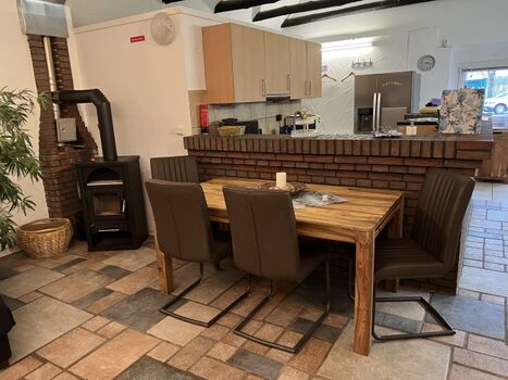 Im Wohnzimmer finden Sie einen großen Flachbild-TV und eine Musikanlage, eine gemütliche große Wohnsitzlandschaft mit Schlaffunktion und einen Essbereich für 6 Personen und es ist ebenfalls eine gemütliche Kamin-Ofen- Ecke für die kalten Tage vorhanden.