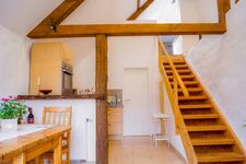 Traumhafte Wohnung offen über zwei Ebenen gestaltet. Auf 55 qm befindet sich eine offene volleingerichtete Küche mit einem großzügigem Essbereich, ein Schlafzimmer, ein Bad mit Badewanne und Dusche und auf der Empore ein Wohnzimmer mit großem Fernseher.