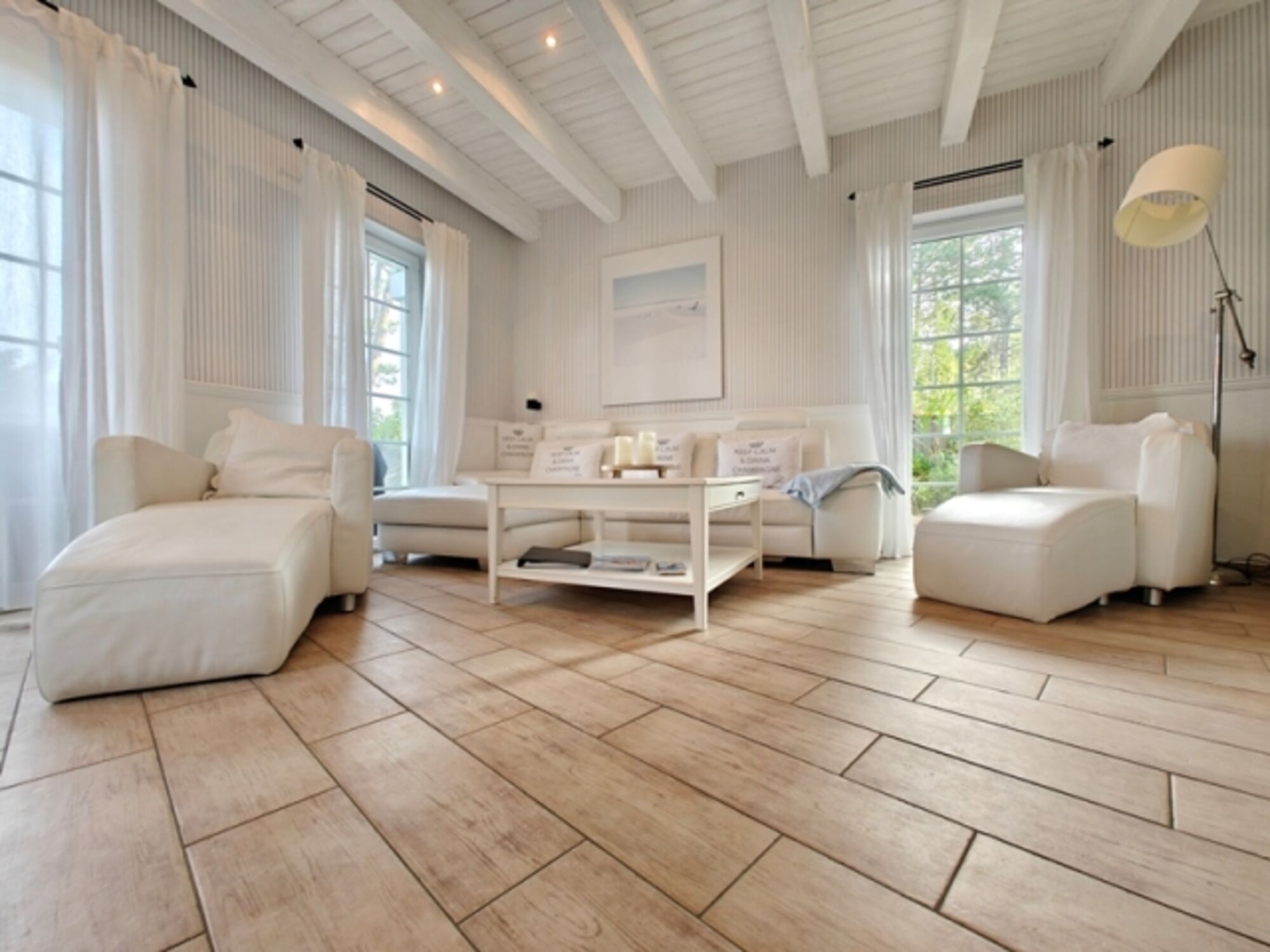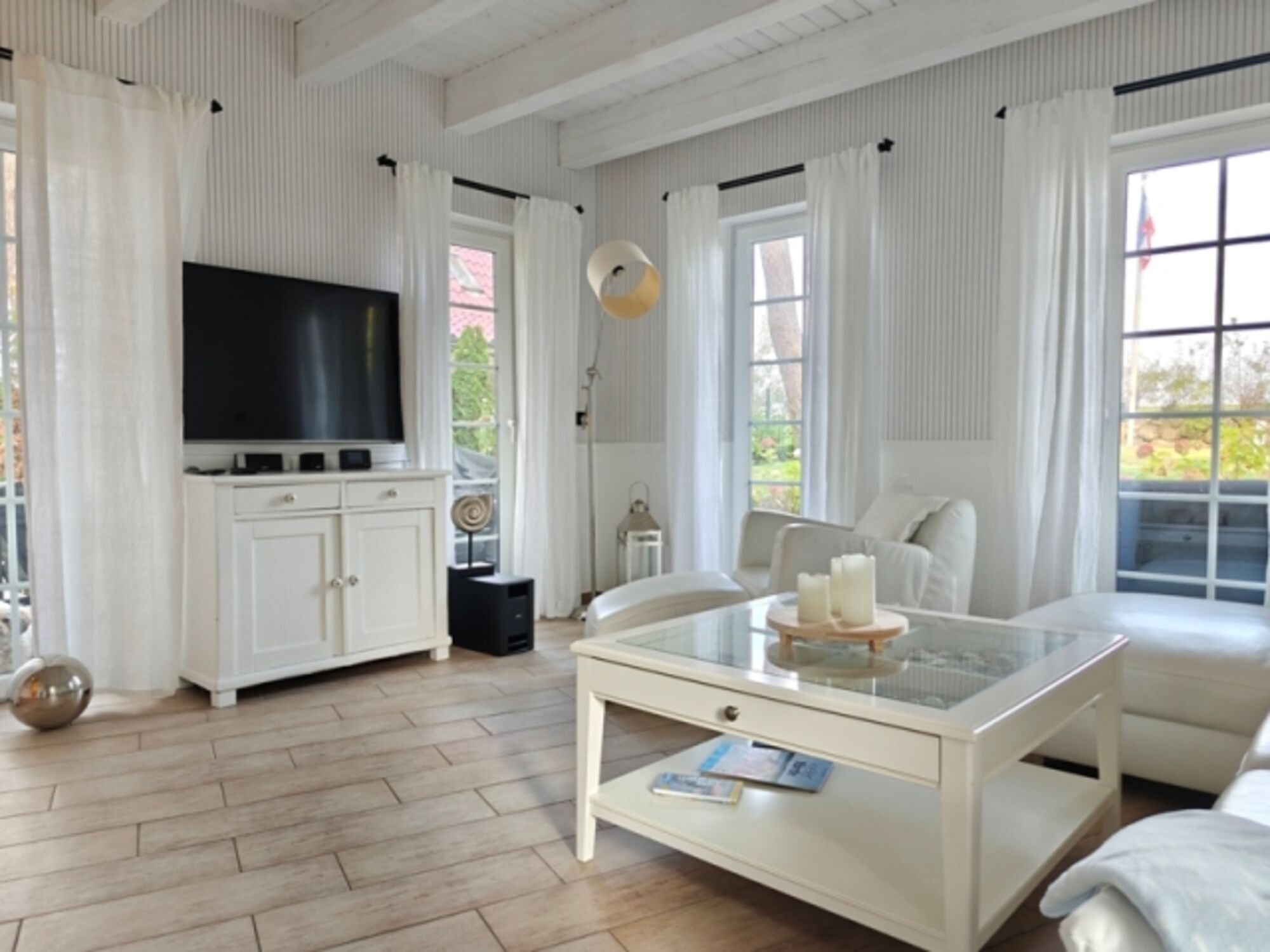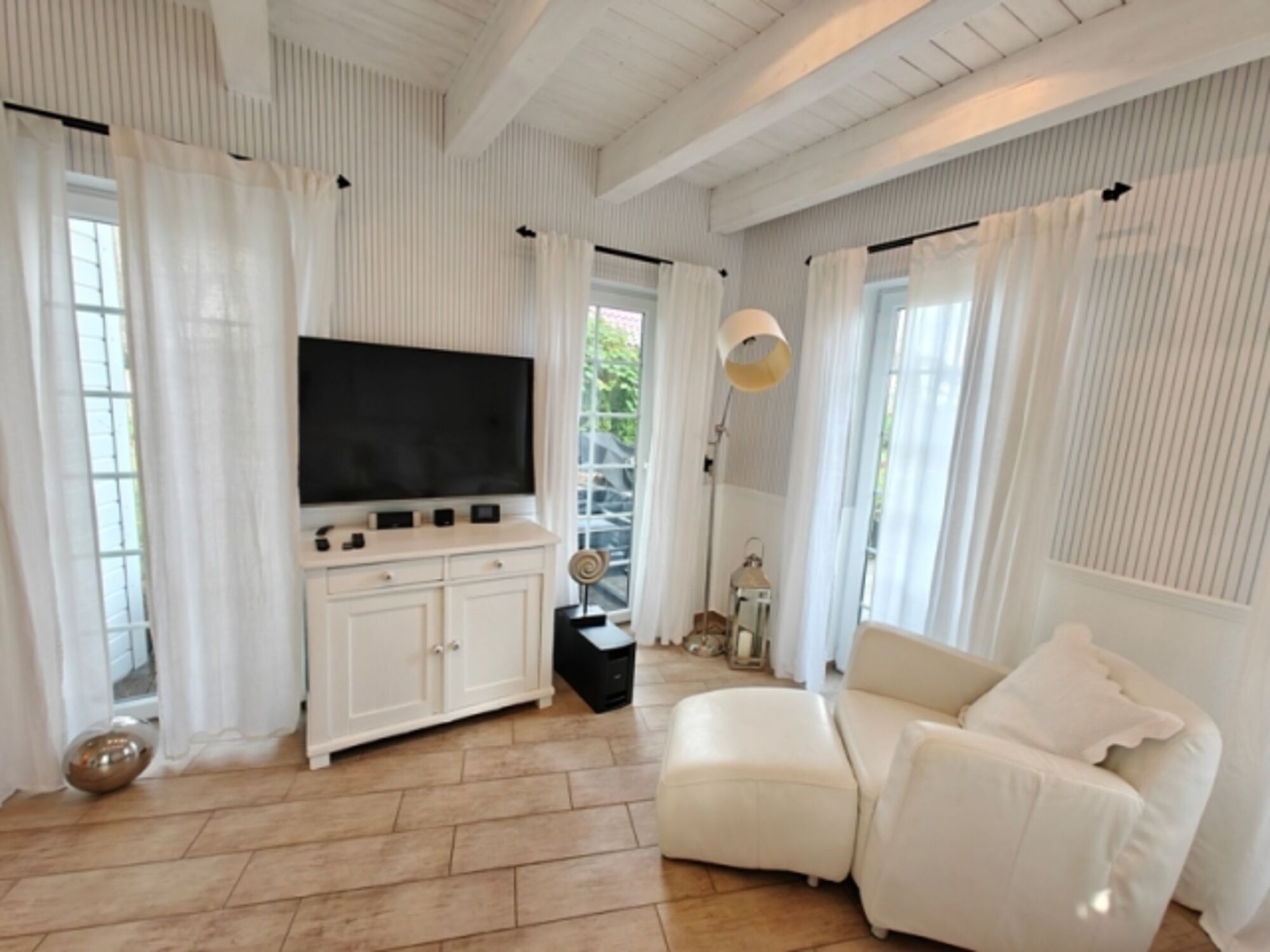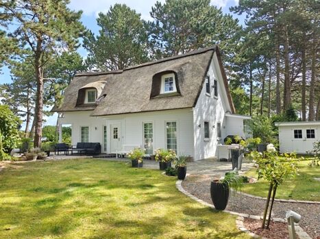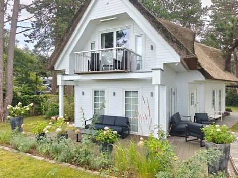Außenausstattung: 3 Außenterrassen, Balkon mit Meerblick, 2 PKW-Stellplätze, Gartenmöbel, Liegen, Weber-Gasgrill, Holzkohlegrill, Bollerwagen, Strandkorb am Haus, Sauna, Außendusche
