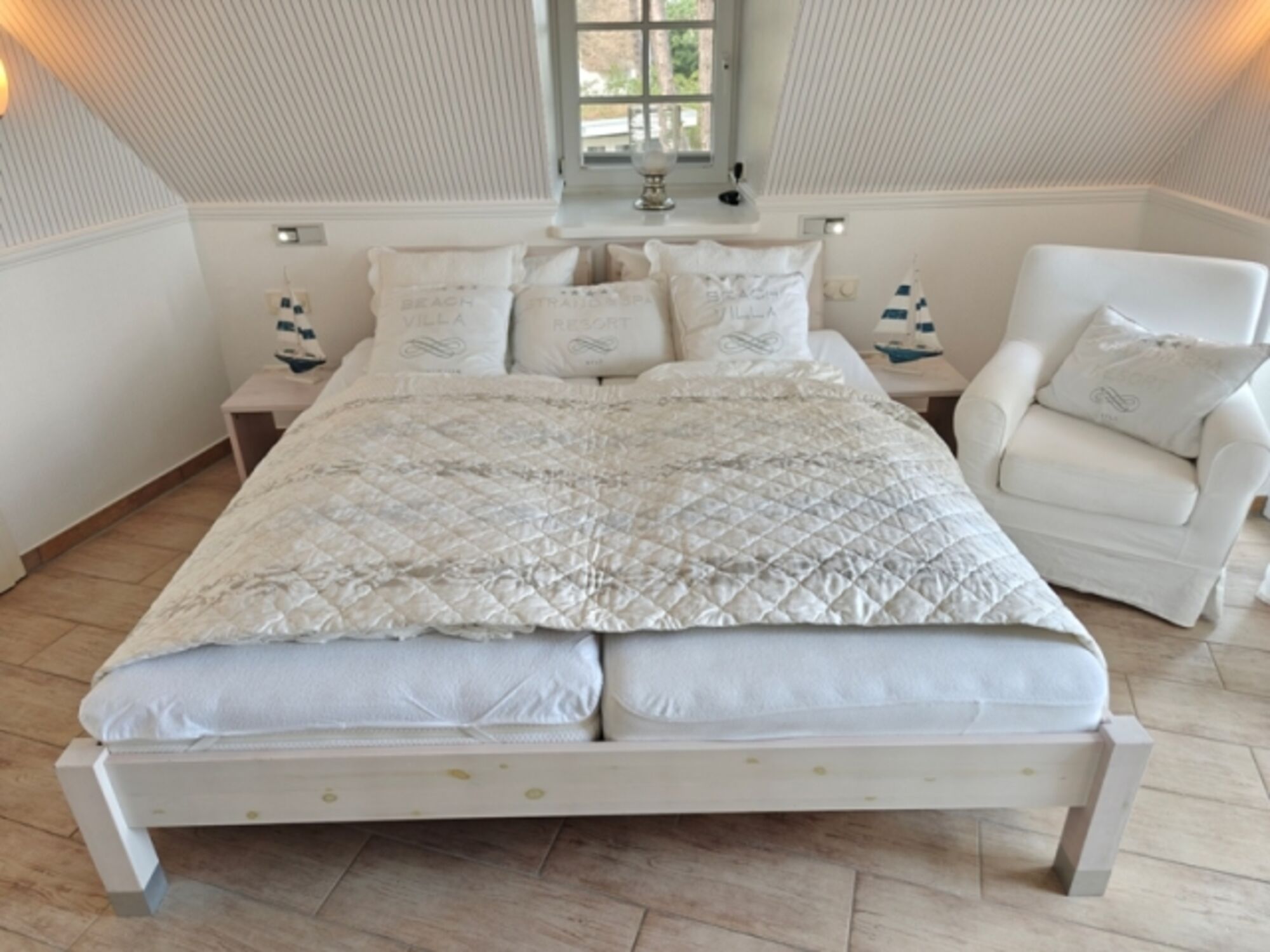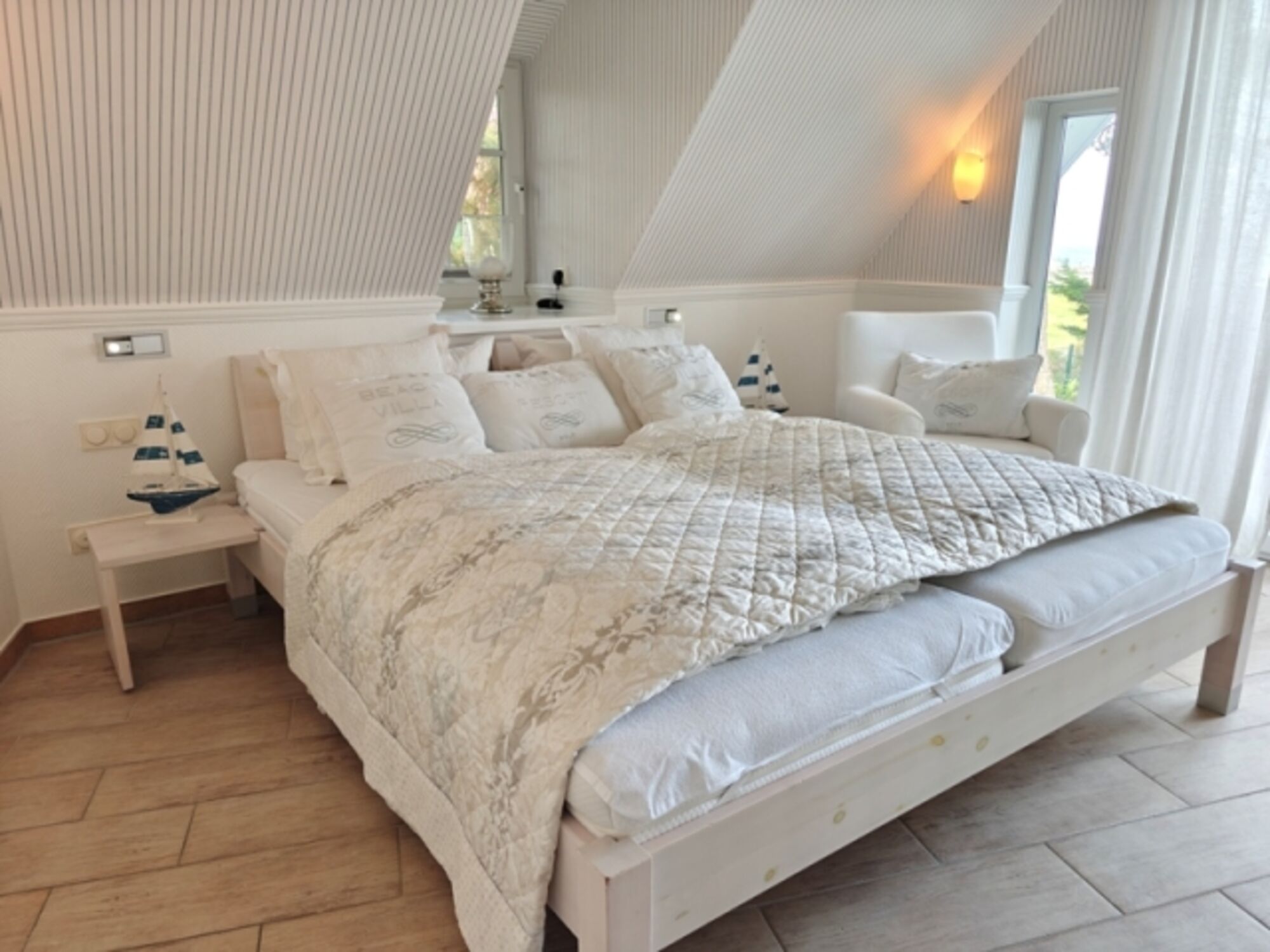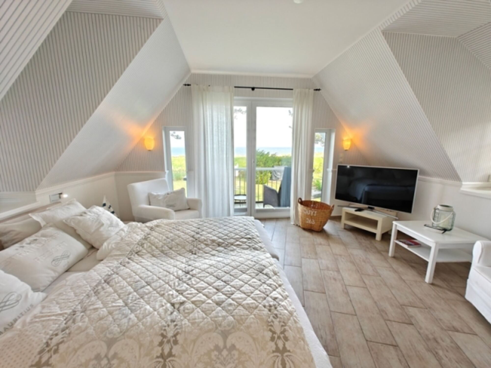 Das große Schlafzimmer ist unter anderem mit einem großen Doppelbett sowie einem Babybett ausgestattet. Ebenfalls gelangt man von dort auf den zur Meerseite gebauten Balkon. Von diesem als auch durch die tiefen Fenster hat man einen spektakulären Blick auf die Ostsee.