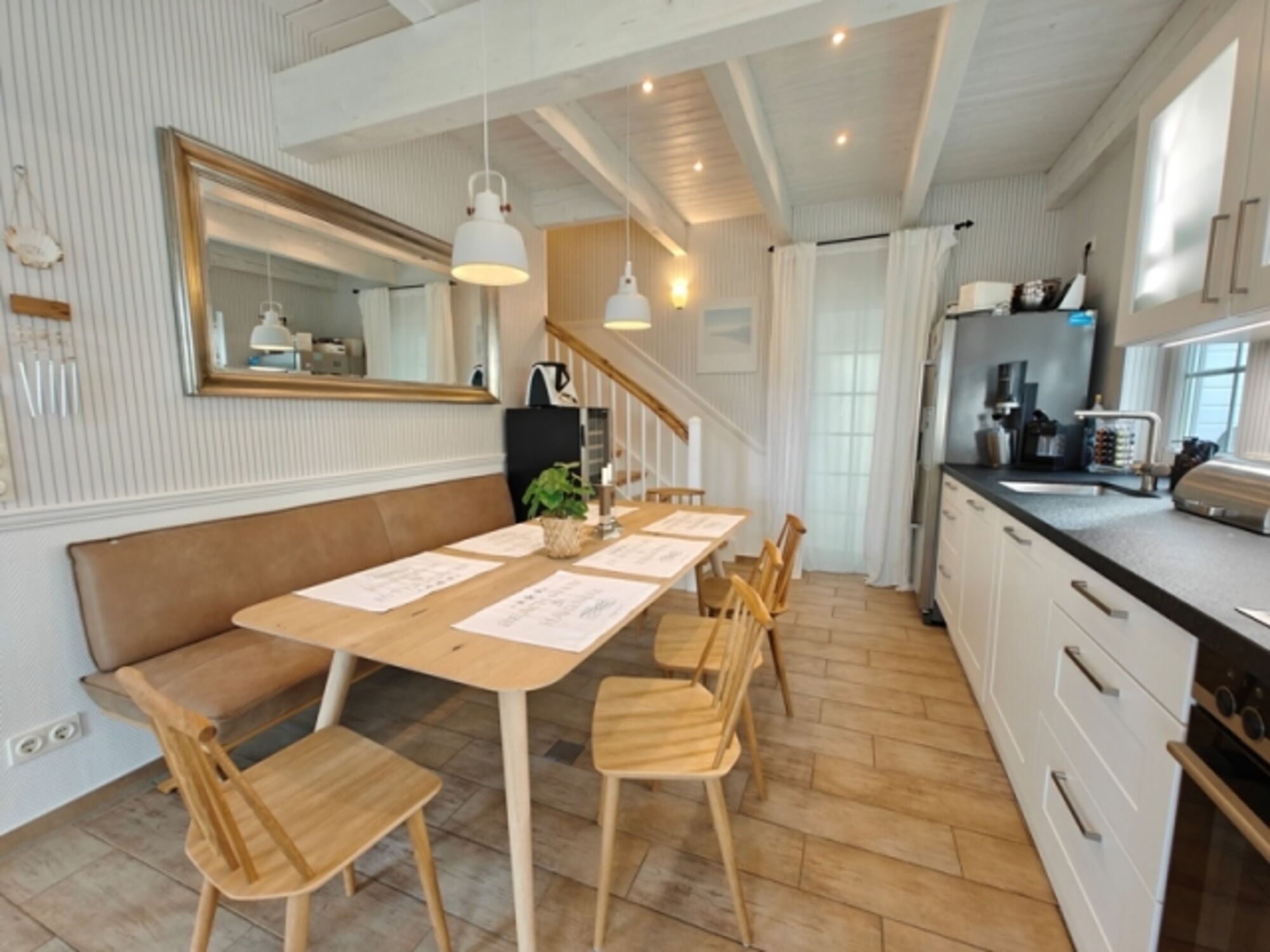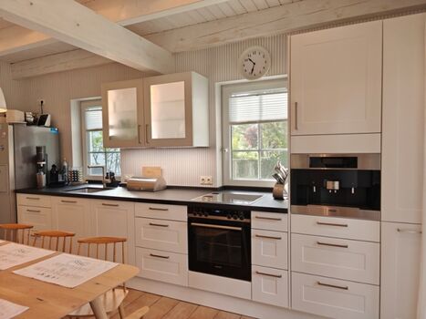 Die Wohnküche ist komplett ausgestattet und verfügt neben einem Großraum-Kühlschrank mit Ice-Maker, Mehrzonenklima-Weinschrank, Geschirrspüler auch über einen integriertem High-End Kaffee-Vollautomaten von Miete. Die Ferienvilla kann mit max. 6 Personen sowie einem Baby belegt werden. Die 3 Schlafräume sowie das Wannenbad befinden sich im Obergeschoss.