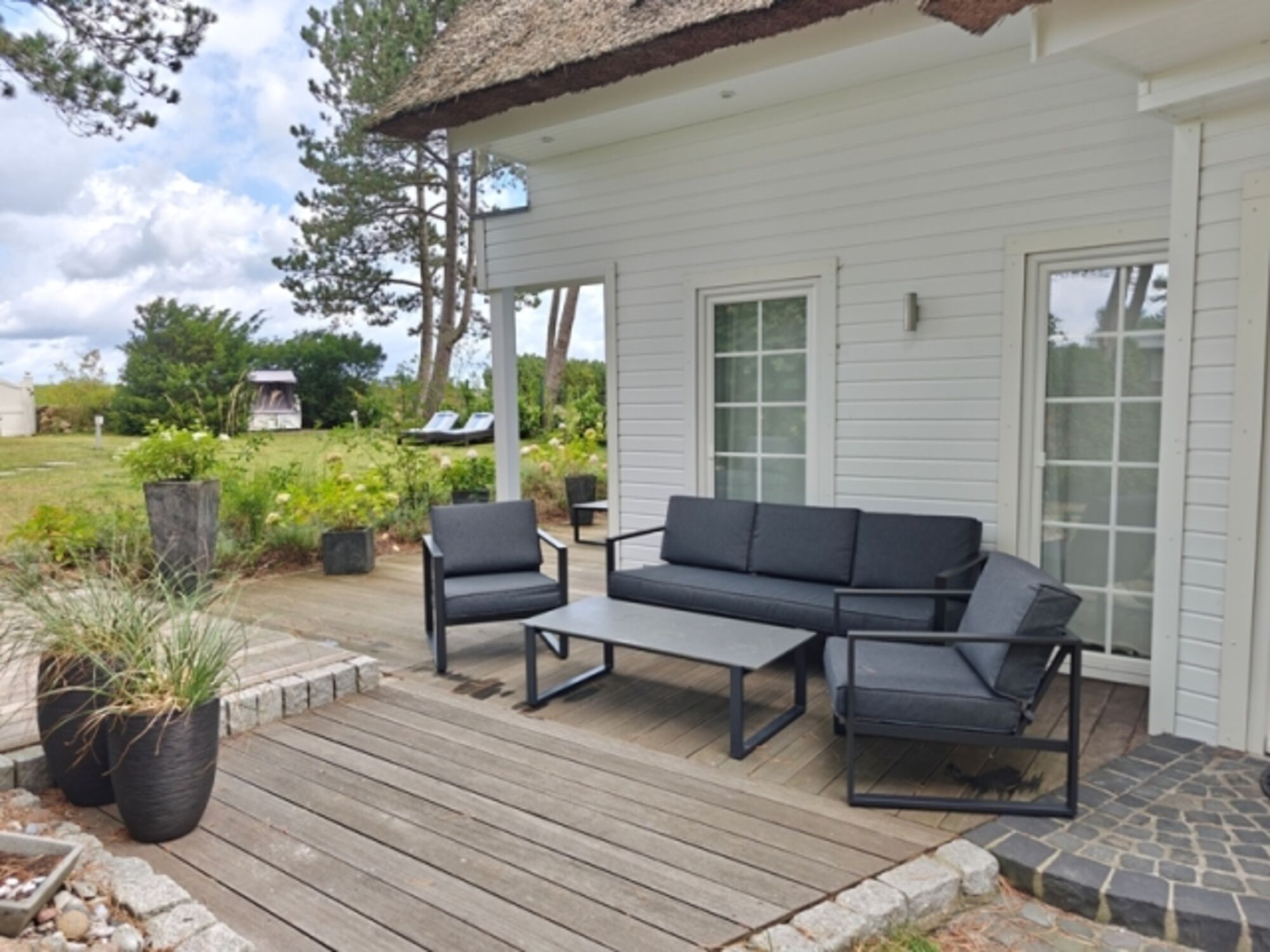 Die aufwändig gestaltete Außenanlage verfügt über mehrere Terrasse mit diversen Sitz- und Relaxmöglichkeiten. Dafür stehen Liegen und ein Strandkorb zur Verfügung.
