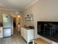 Die ins Wohnzimmer integrierte Küchenzeile ist neu und komplett ausgestattet mit Geschirrspüler, großem Kühlschrank inklusive Gefrierfach, Kaffeemaschine und Stauraum für Ihre Einkäufe und das Hundefutter.