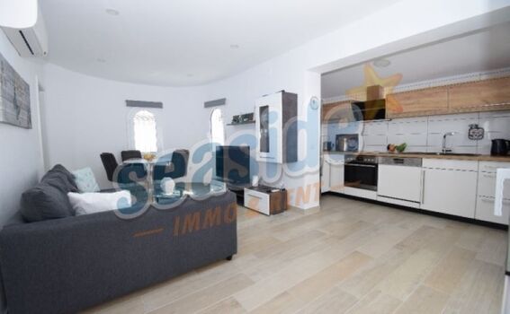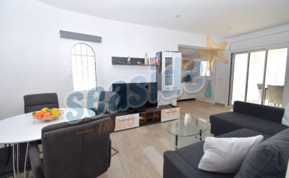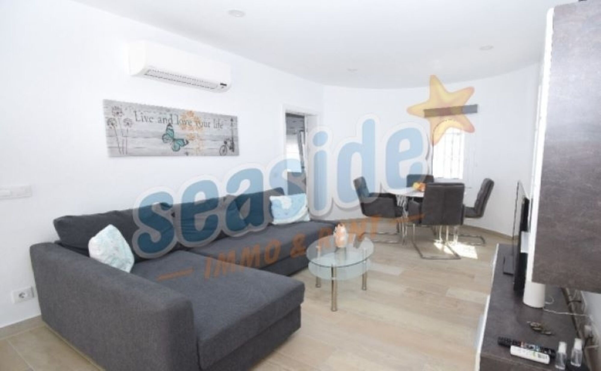 Sonniges Wohnzimmer mit Klima, Eck-Couch, SAT-TV und Zugang zur Terrasse und Pool.