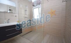 1 Badezimmer mit ebenerdiger XXL-Dusche, WC und Waschbecken, Fenster mit Fliegengittern und elektrischen Rollläden .