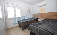 1 Schlafzimmer mit Doppelbett (2 Einzelmatratzen), Klima, Kleiderschrank, Fenster mit Fliegengittern und elektrischen Rollläden.