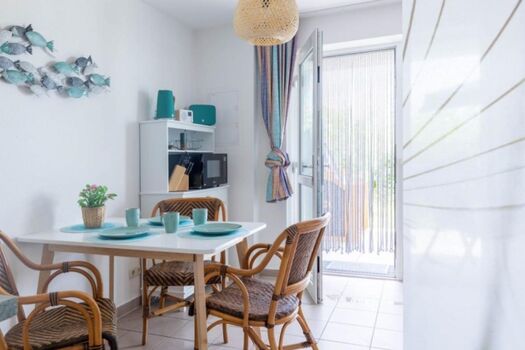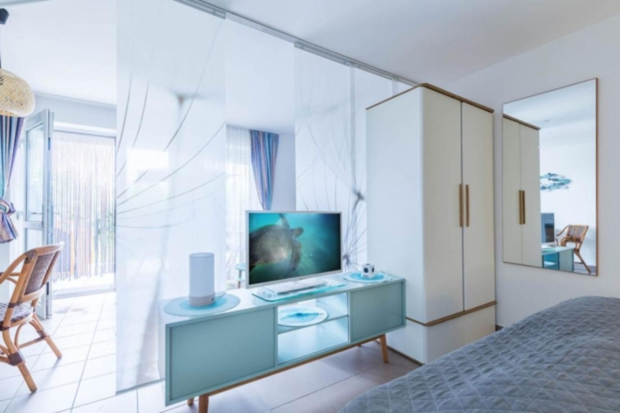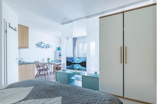 Wohn, Schlaf- und Essbereich sind offen miteinander verbunden, eine kleine Singleküche mit angeschlossener Essecke reihen sich hervorragend ein. Die moderne und gemütliche Einrichtung sorgt mit ihren frischen Meeresfarben für herrliche Urlaubsstimmung. Der Flatscreen-TV befindet sich mittig zwischen dem Wohnbereich und Schlafbereich und kann somit durch einfaches Drehen von beiden Bereichen genutzt werden. Die bequeme Couch bietet bei Bedarf eine dritte Schlafmöglichkeit.