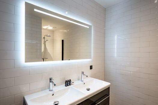 Waschbecken, Regendusche, Spiegel
