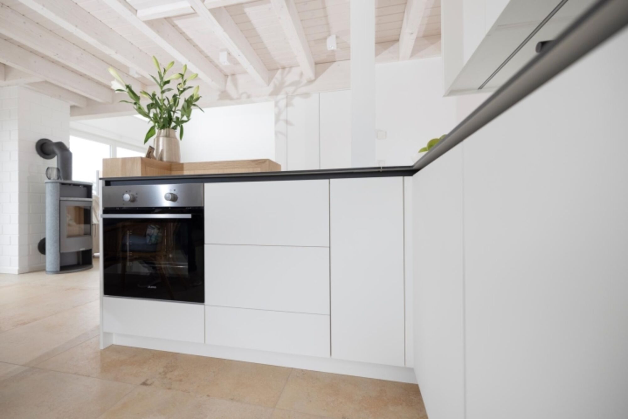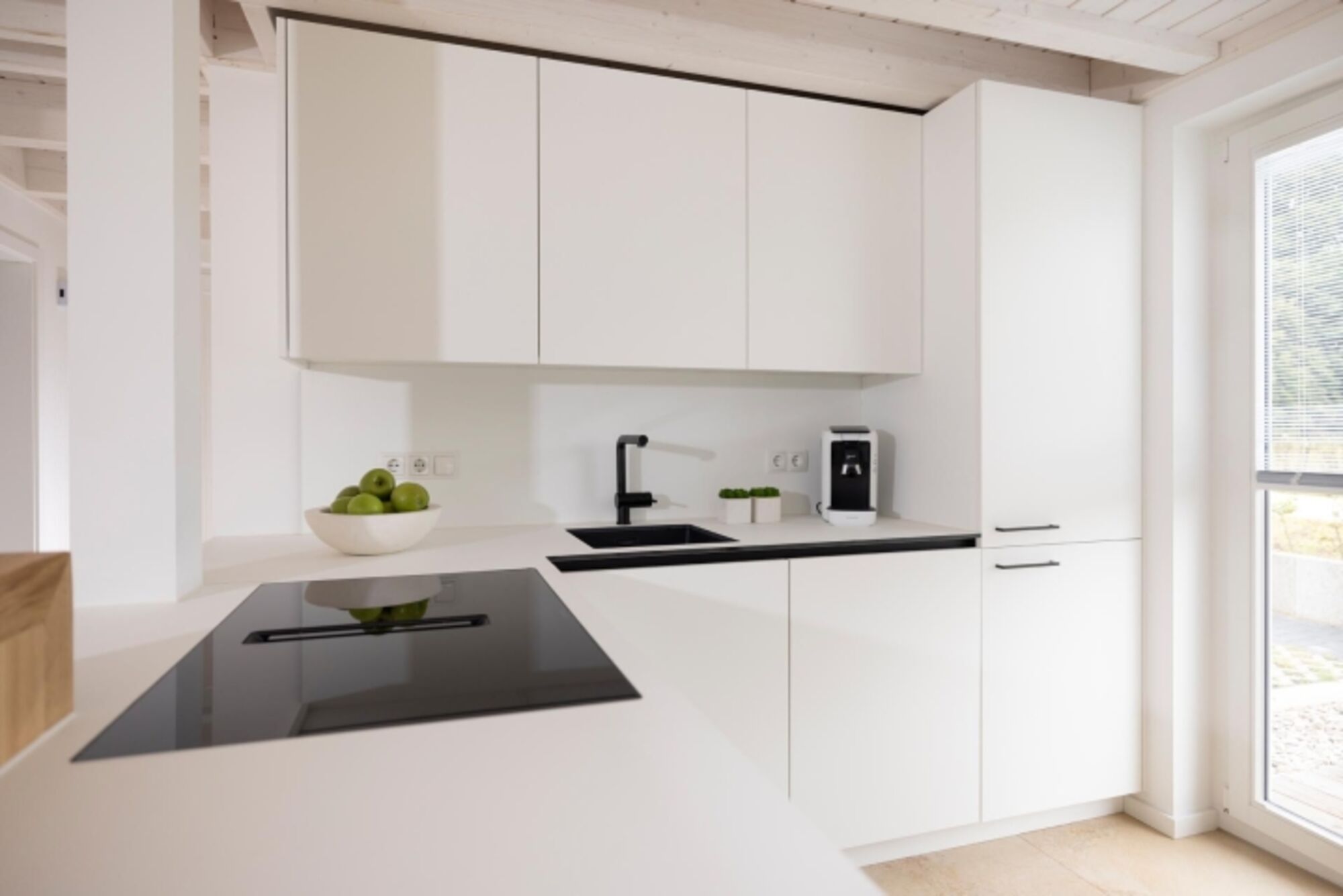 Induktionsherd, Dunstabzugshaube, Gefrierschrank, Senseo-Kaffeeautomat, Essplatz in der Küche