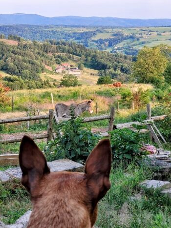 Auf dem Hof des Besitzers hinter Zaeunen sind Hunde, Katzen, Hühner, Ziegen, ein Pferd und ein Esel zu Hause.