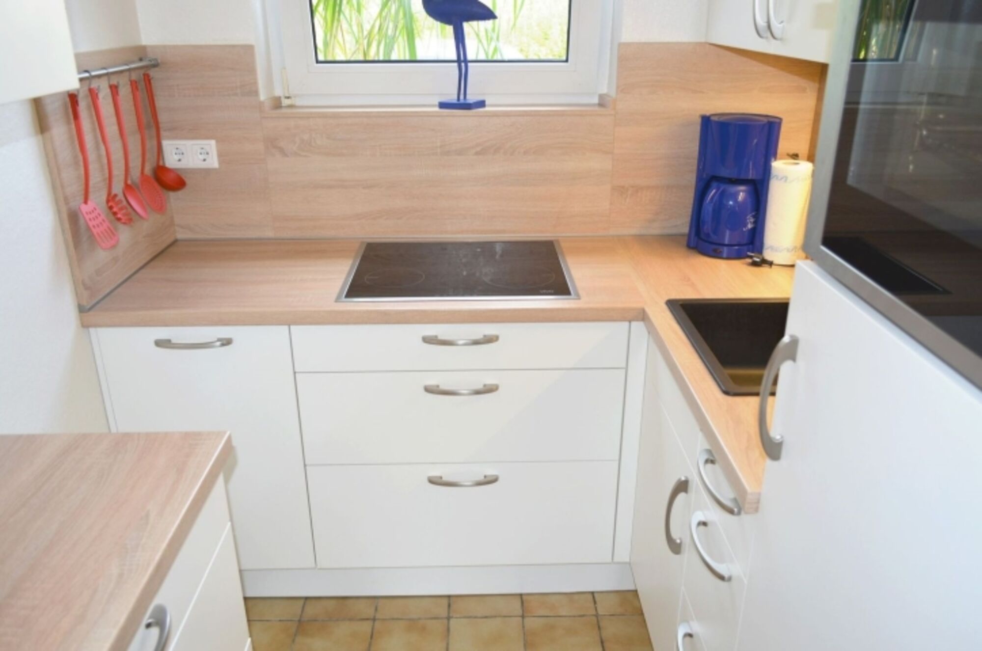 4-Platten Herd, Induktionsherd, Dunstabzugshaube, Kühlschrank mit Gefrierfach, Nespresso-Automat, Eierkocher, Mixer