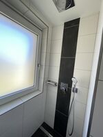 Waschbecken, Regendusche, Spiegel, Fenster im Bad, Fliegengitter