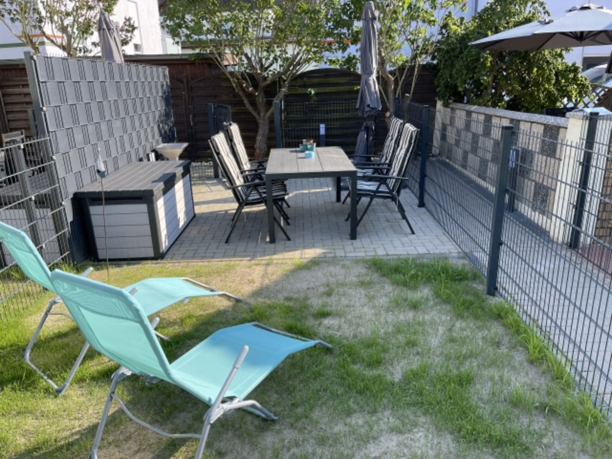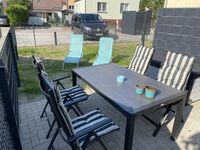 Terrassenmöbel und Grill stehen jeweils zur Verfügung.