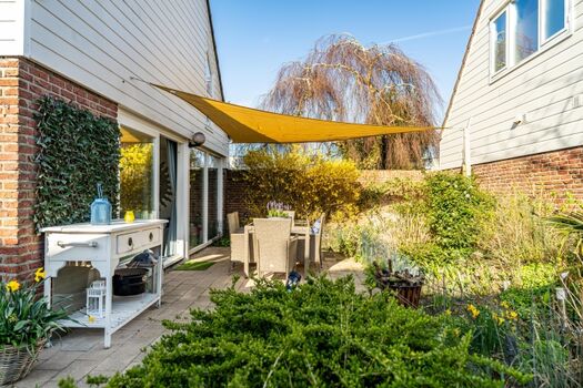 - einen gemütlichen Garten mit einer teilweise überdachten Terrasse und Gartenset für 6 Personen