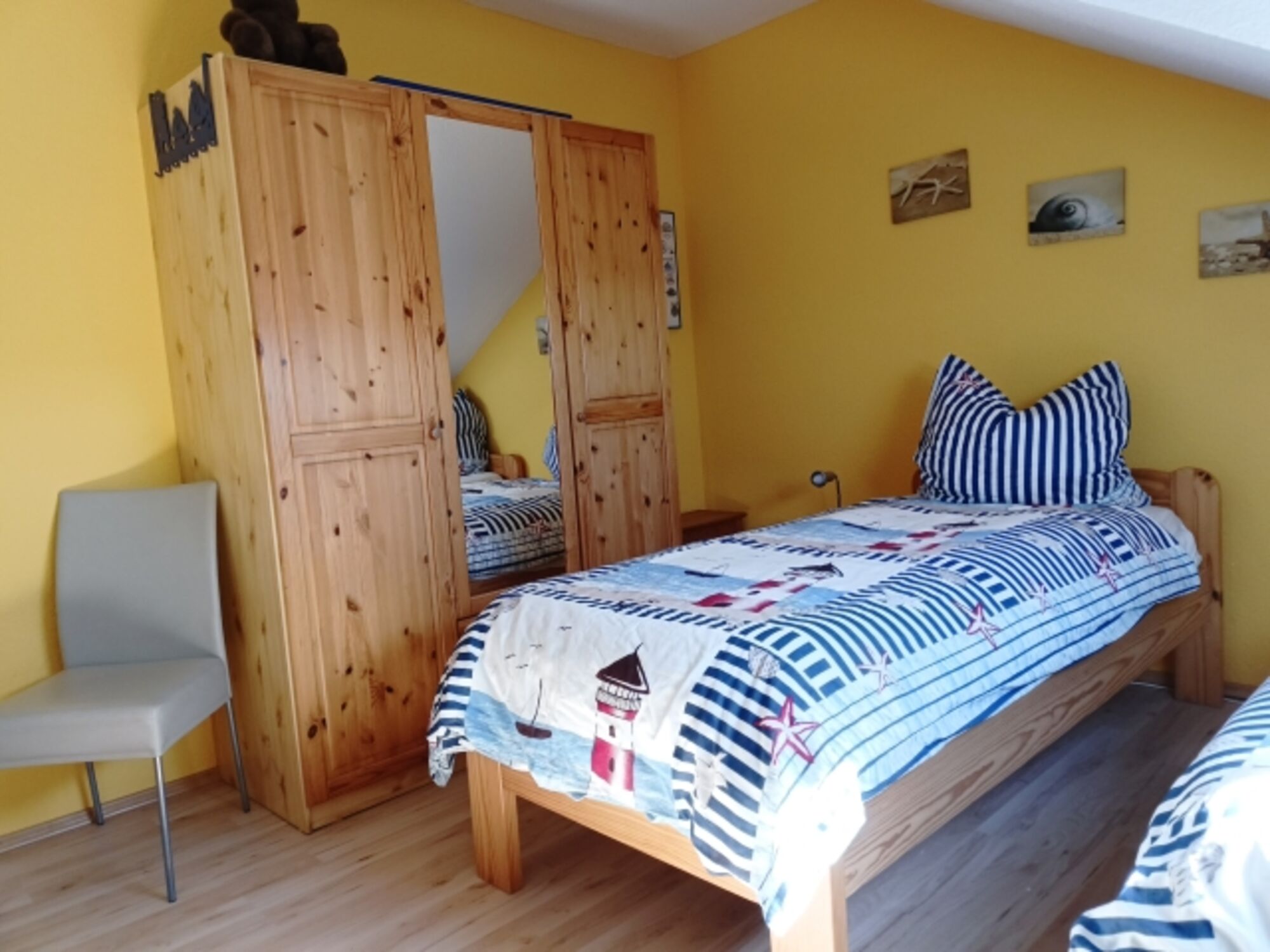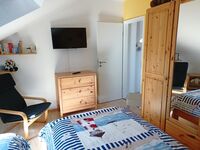 Smart-TV vorhanden, diverse Spiele und Bücher liegen bereit, das Kinderreisebett steht zur Nutzung bereit, eine separate Matratze für den erholsamen Schlaf des Kindes ist vorhanden . Ein Hochstuhl mit Sitzverkleinerer u. Türgitter befinden sich in der offenen Galerie. Hier finden Sie auch ein SMART-TV. Einzelbett, Kommode, Spiegel, Leselampe am Bett, Fliegengitter