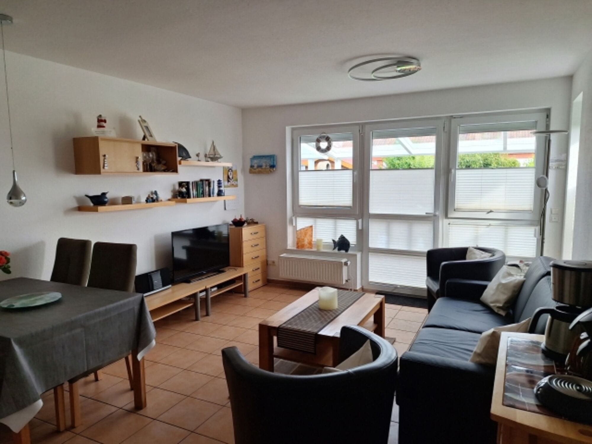 TV-Sat, TV-Flachbildschirm, HDTV Flachbildschirm, Bücher, 3er-Sofa, Sessel, Fliegengitter, Spiele