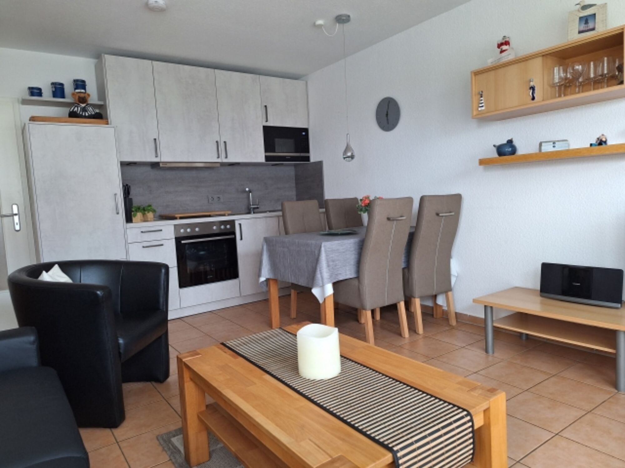 Cerankochfeld, Dunstabzugshaube, Kühlschrank mit Gefrierfach, Senseo-Kaffeeautomat, Eierkocher, Mixer, Korkenzieher / Flaschenöffner, Essplatz in der Küche, TV in der Küche