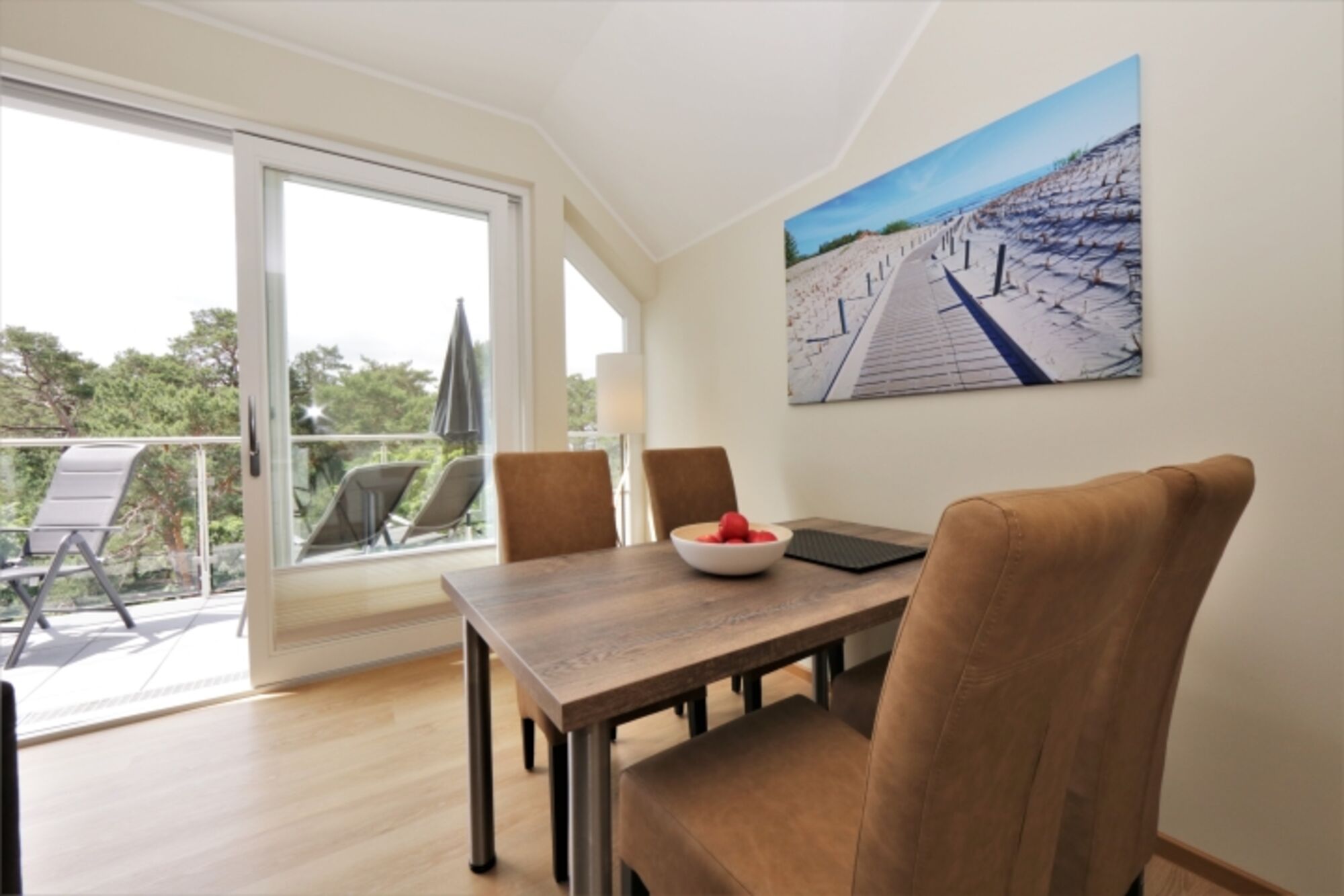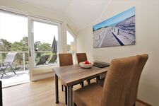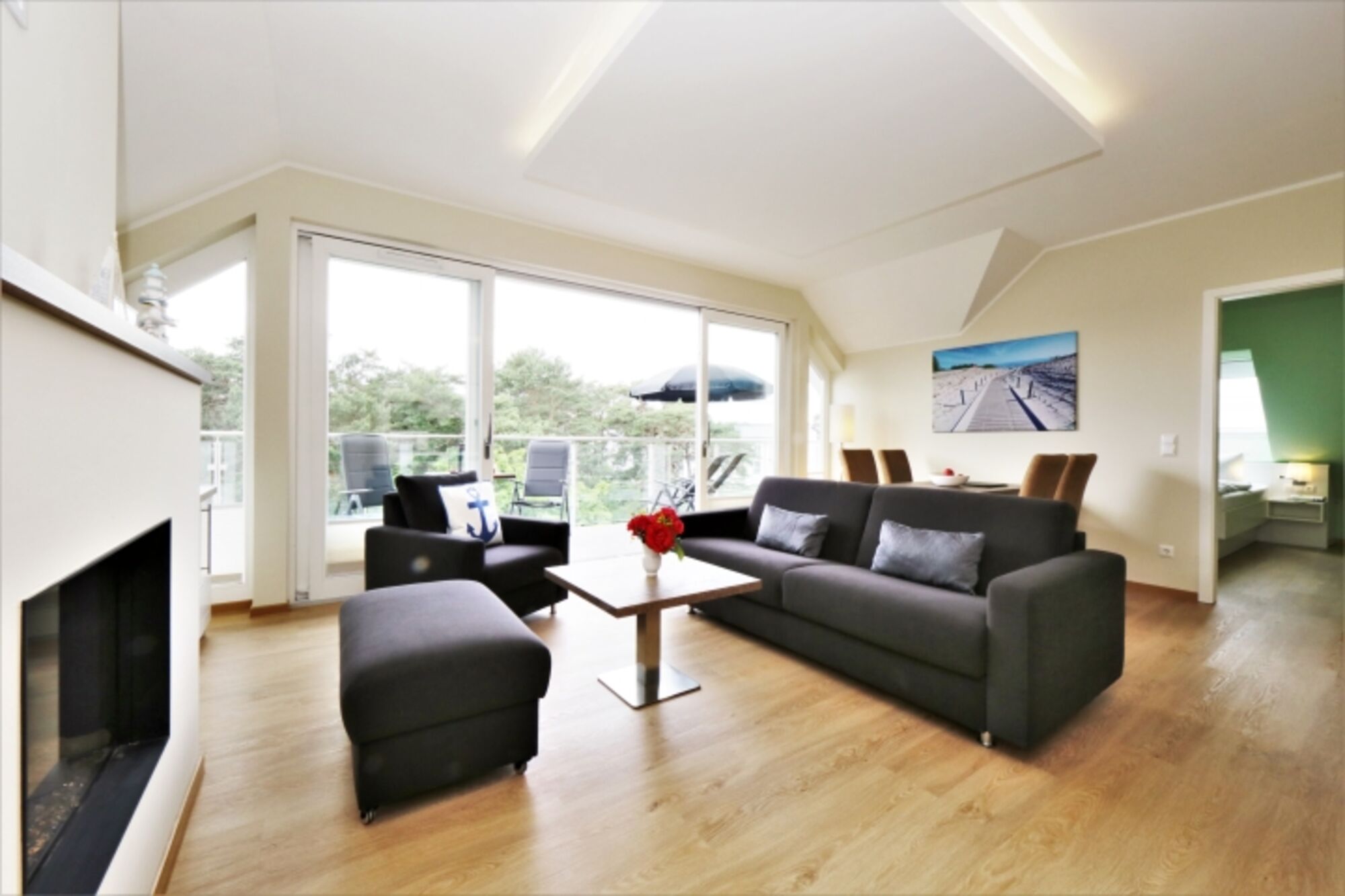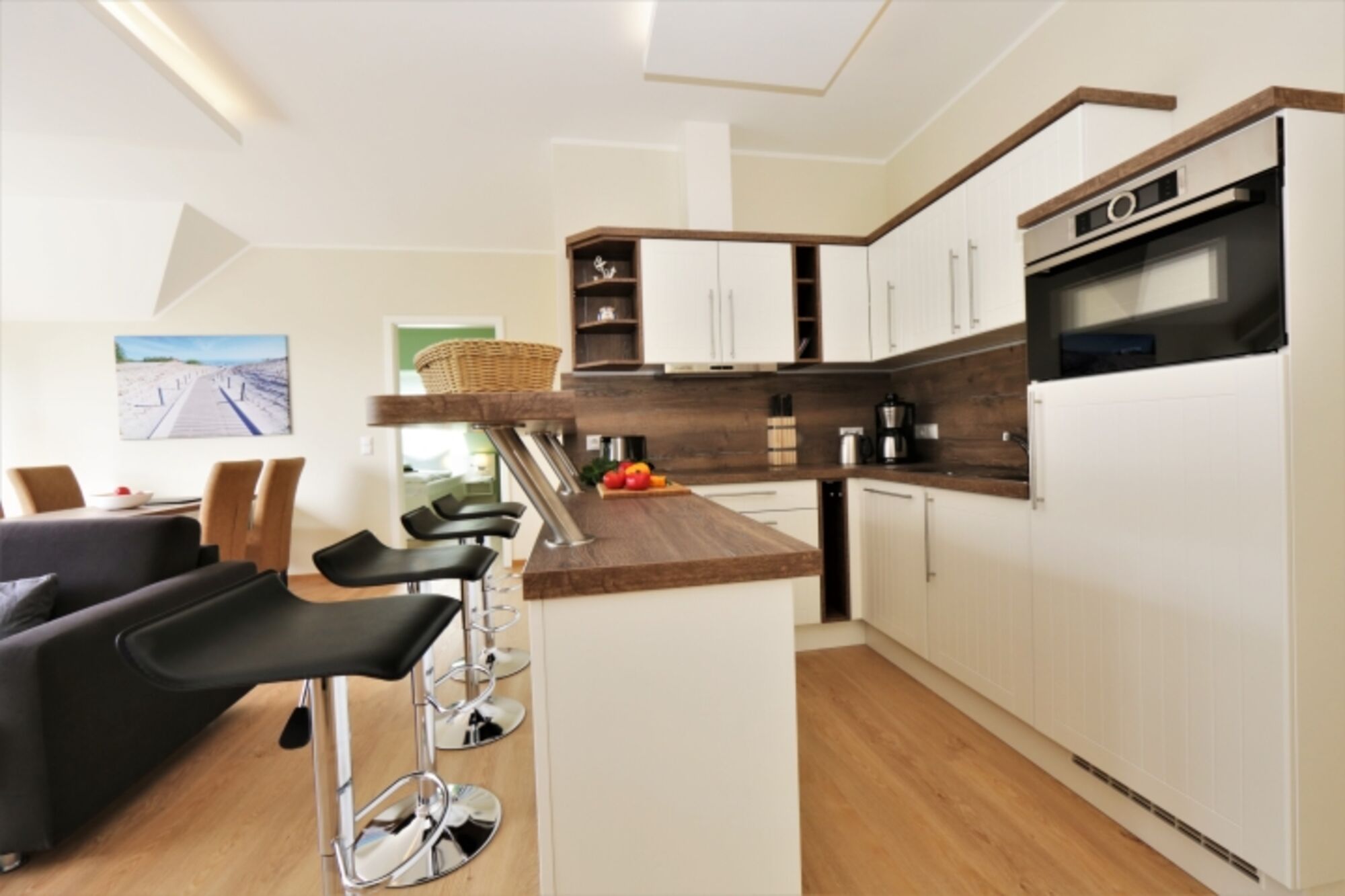Ein Kamin (gasbetrieben) sorgt für Gemütlichkeit und zusätzliche Wärme bei Bedarf. Die moderne offene Küche mit Tresen und Barhockern ist mit Cerankochfeld, Backofen mit integrierter Mikrowelle, Geschirrspüler, Kühlschrank, Kaffeemaschine etc. ausgestattet. Beide Schlafzimmer verfügen jeweils über ein extra großes komfortables Doppelbett mit getrennten Matratzen (90 x 220), reichlich Schrankraum sowie einen eigenen TV. Über das Dachflächenfenster des westlichen Schfazimmers können Sie sogar einen kurzen Bick auf die Ostsee und die Dünenlandschaft erhaschen. Den großen Balkon in Süd-West-Ausrichtung betreten Sie vom Wohnraum. Auf der windgeschützten Dachterrasse (ebenfalls Süd-West-Ausrichtung) können Sie bei entsprechendem Wetter sommerliche Sonnentage bereits ab März bis in den November hinein genießen. Sitzgelegenheiten und Sonnenliegen sind vorhanden.