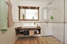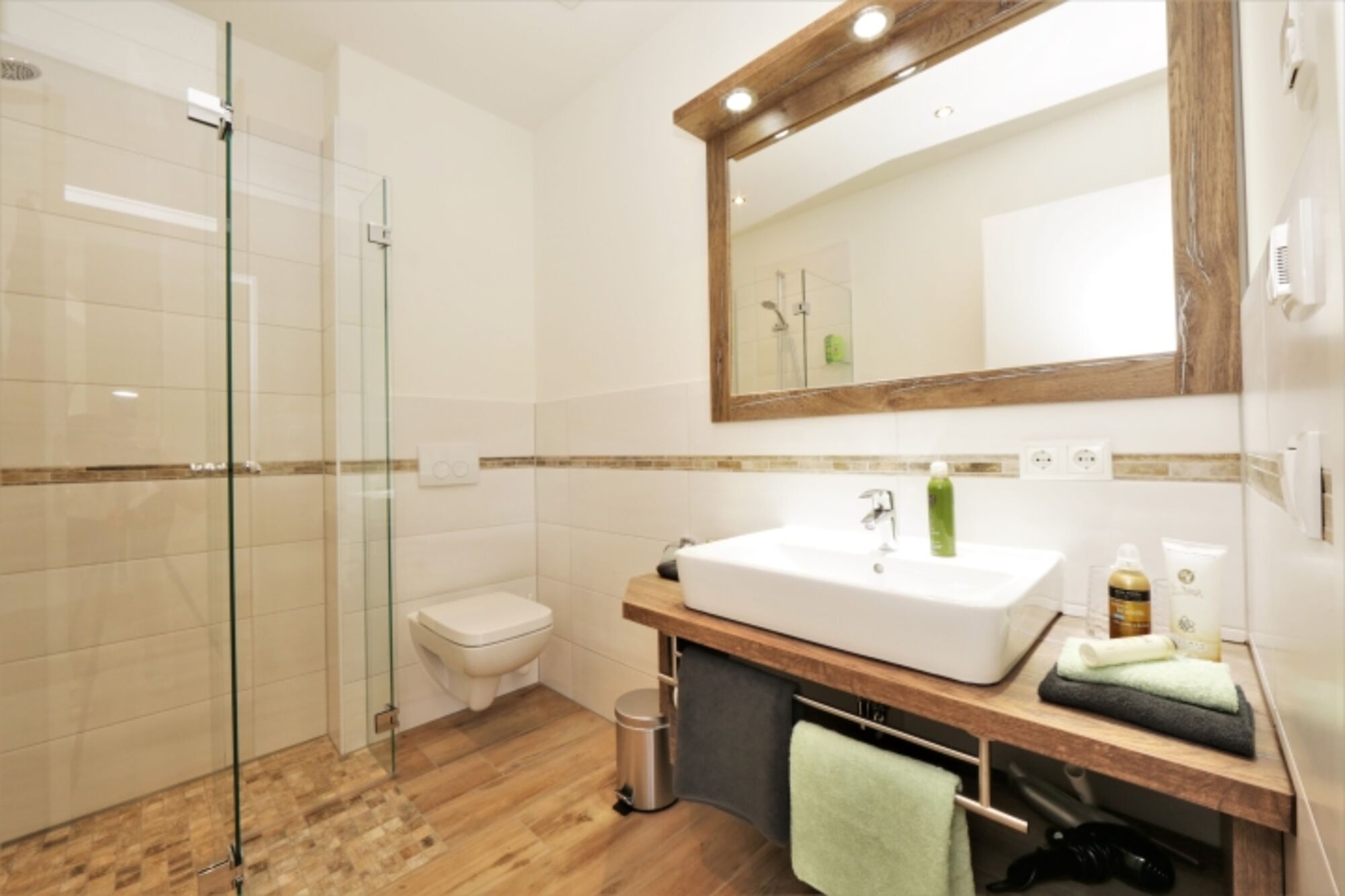 Beide Badezimmer sind mit einer bodengleichen Dusche mit Echtglasabtrennung und Waschtisch/WC ausgestattet. Zur Ausstattung gehören jeweils ein Fön und Fußbodenheizung.