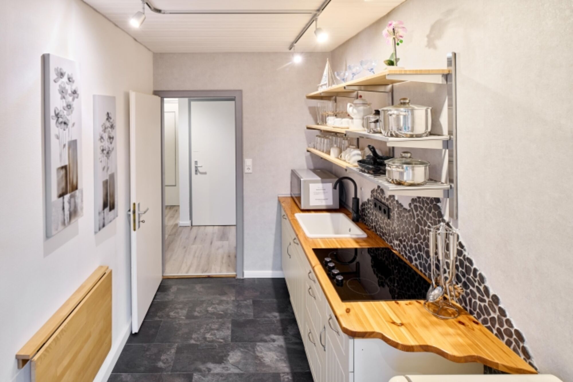 Induktionsherd, Kühlschrank mit Gefrierfach, Korkenzieher / Flaschenöffner, Essplatz in der Küche