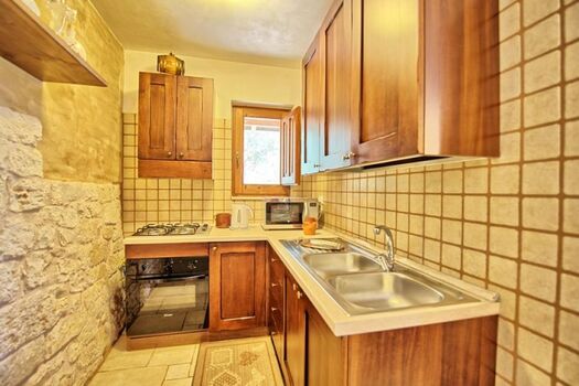 4-Platten Herd, Gasofen / Gasherd, Dunstabzugshaube, Kühlschrank mit Gefrierfach, Korkenzieher / Flaschenöffner, Gewürze (Salz, Pfeffer, Zucker), Geschirrhandtücher, Mülltüten, Essplatz in der Küche