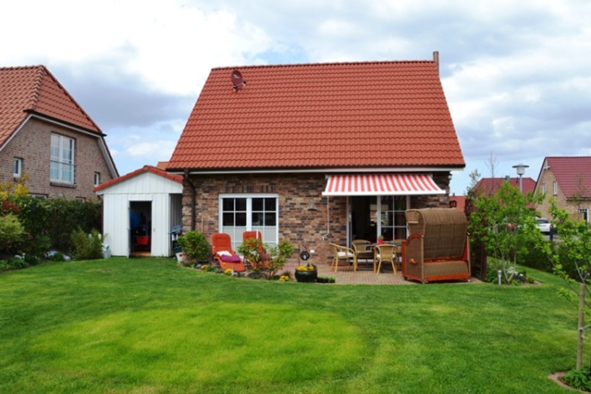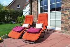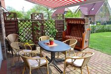 Außenausstattung: eingezäunter Garten, Terrasse, Gartenmöbel, Strandkorb am Haus, Liegen, Grill, Markise, Carport